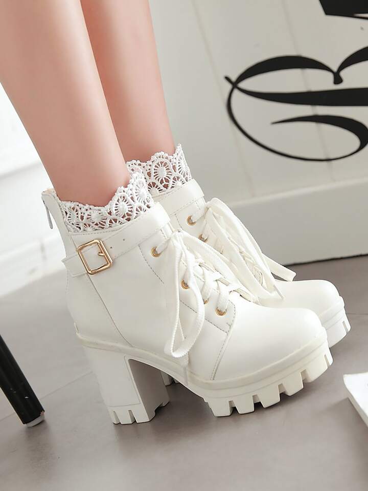 Women Lace & Buckle Decor Lace Up Front Buckle Detail Chunky Heeled Fashion Boots