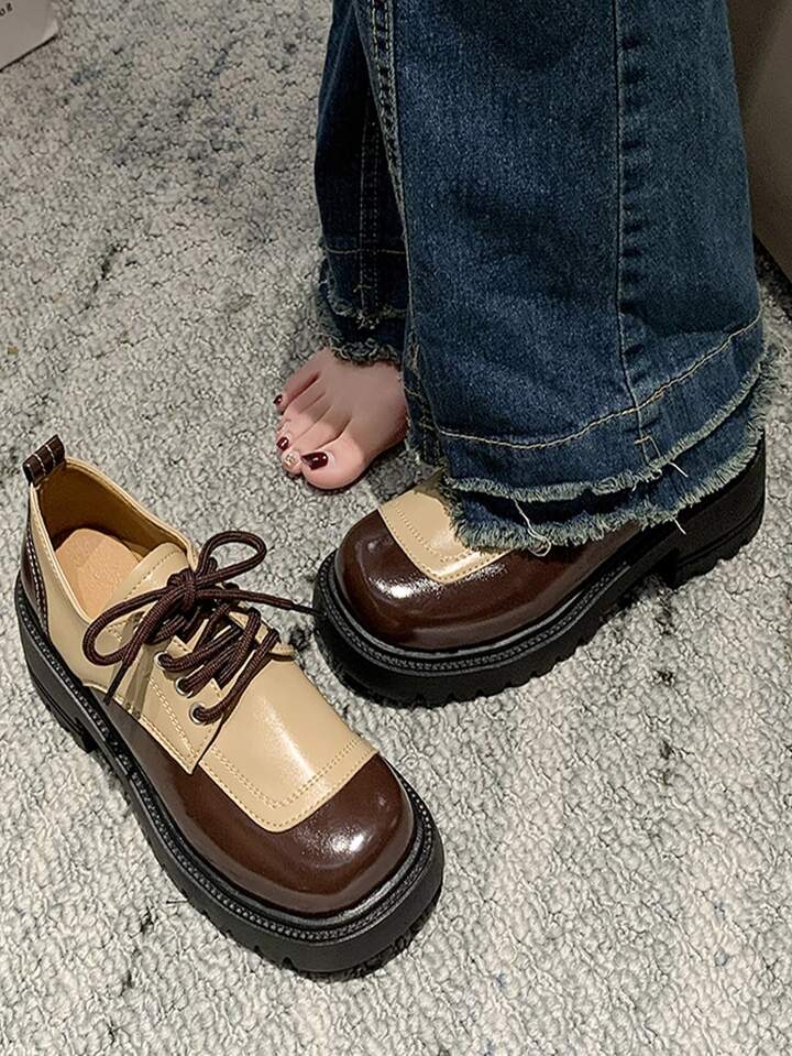 Women Lace Up Two Tone Flatform Shoes, Preppy Outdoor Flatform Oxford Shoes
