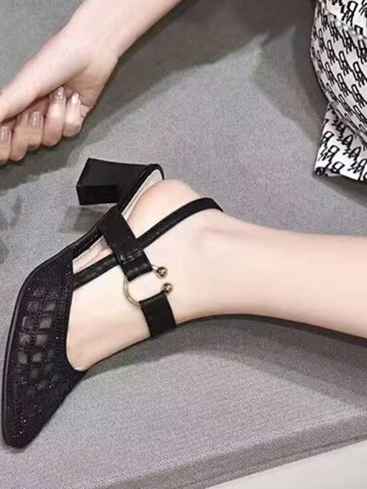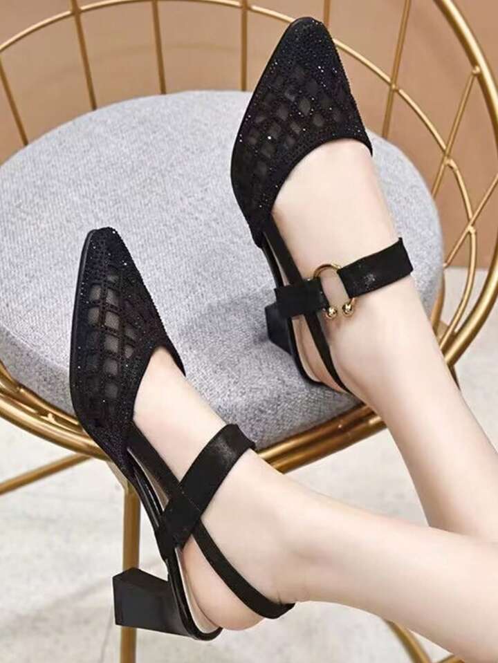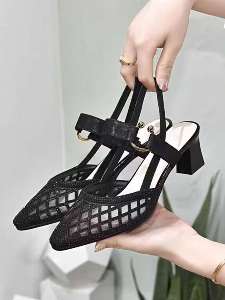 Women Mesh Panel Chunky Heeled Slingback Pumps, Glamorous Black Mesh Pumps