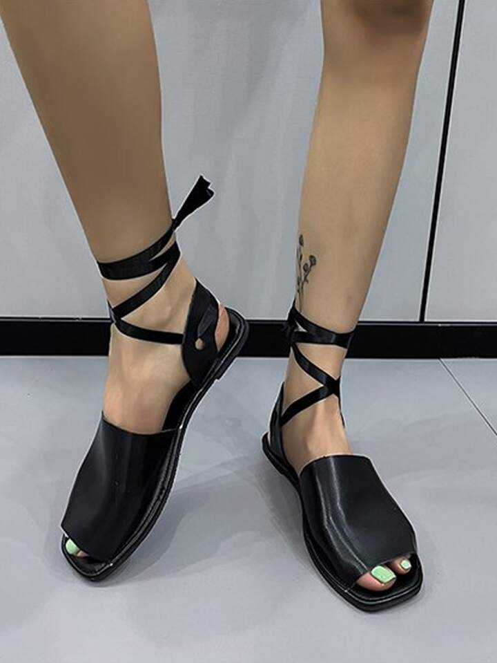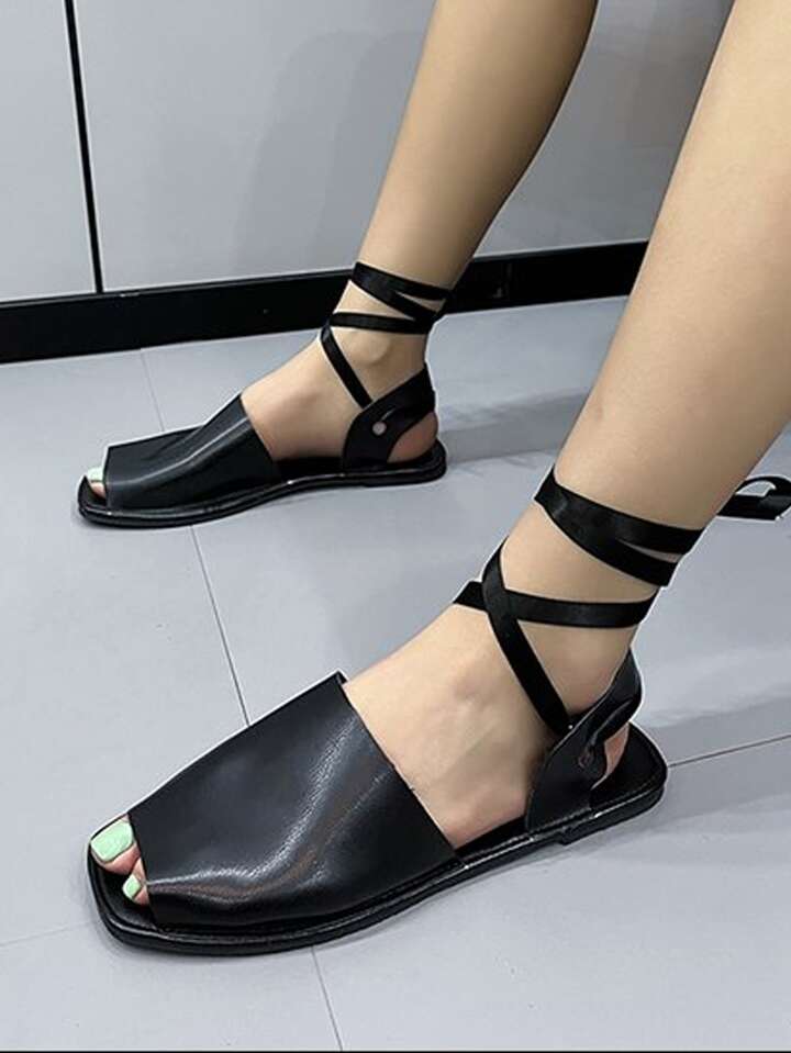 Women Peep Toe Tie Leg Design Sandals, Fashionable Black Strappy Sandals
