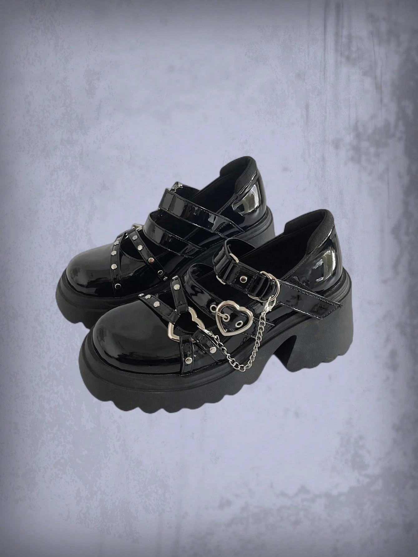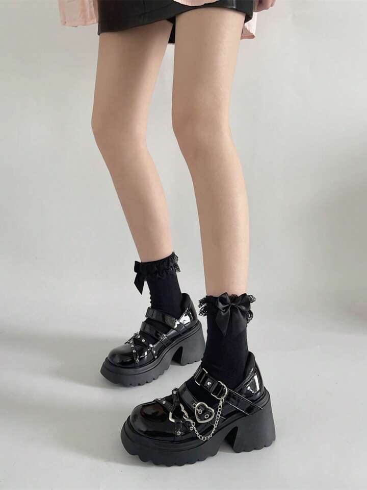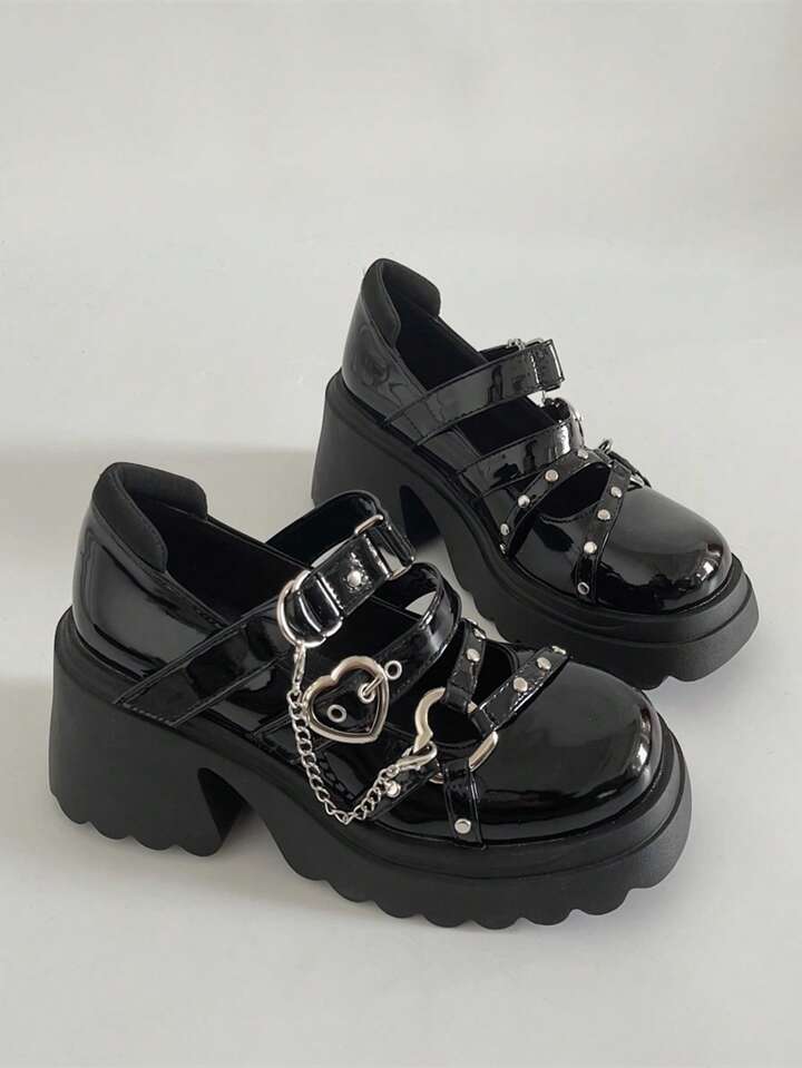 Women Studded & Chain Decor Platform Mary Jane Shoes, Punk Black Flatform Shoes
