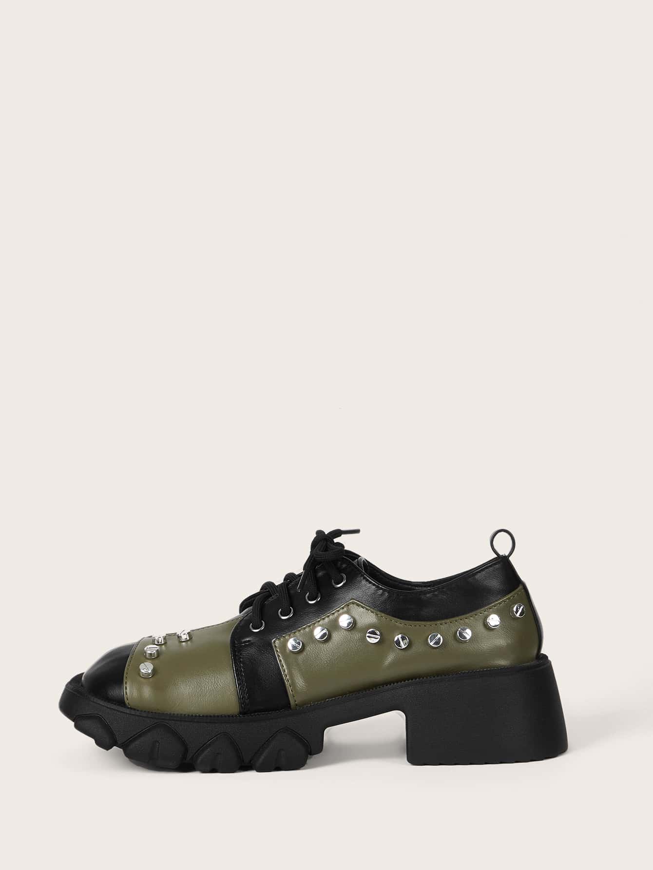Women Two Tone Studded Decor Square Toe Platform Shoes, Punk Platform Oxford Shoes For Outdoor