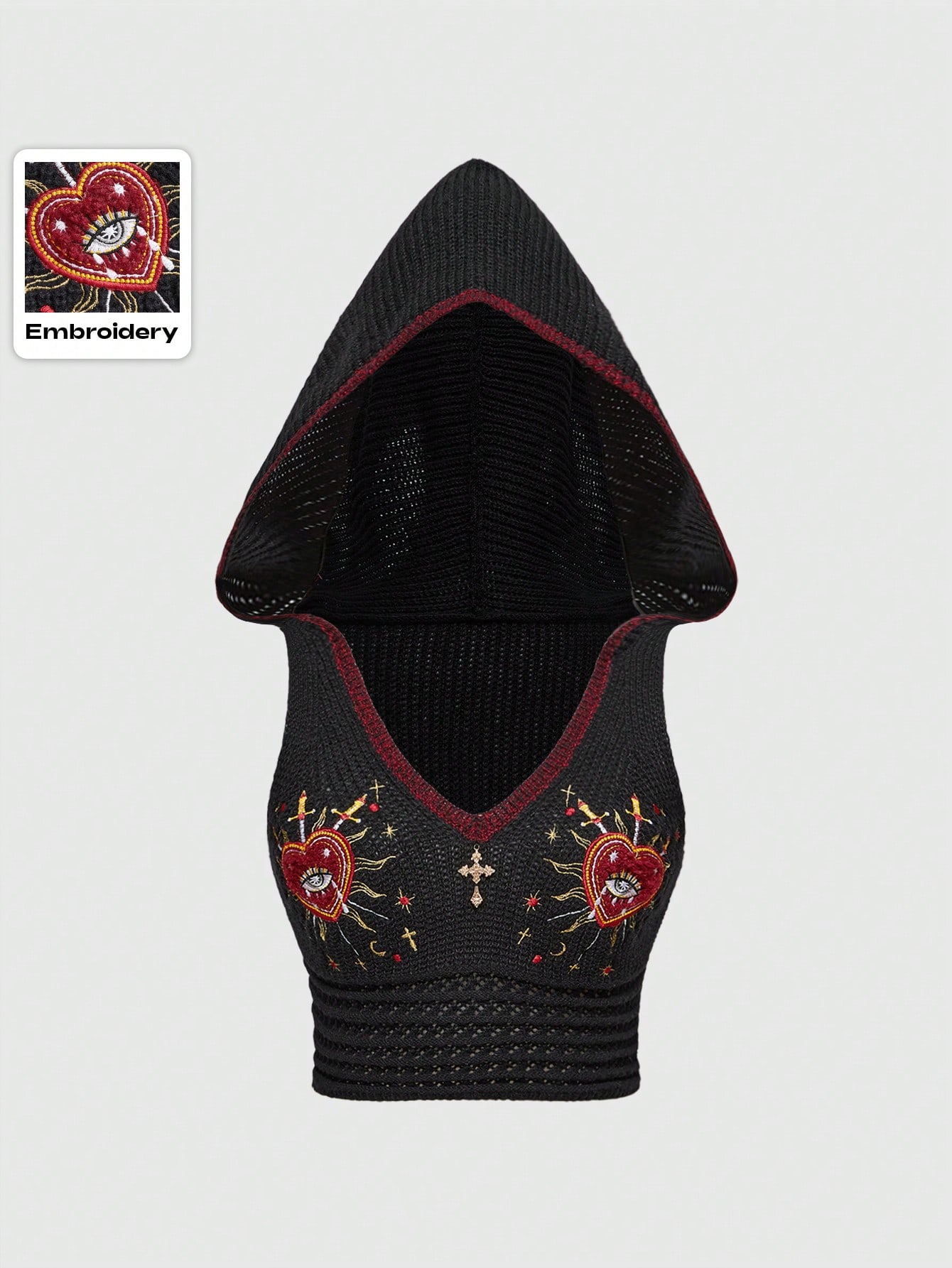 Women Y2K Goth Heart Eye Cross Embroidery Hooded Knit Sweater