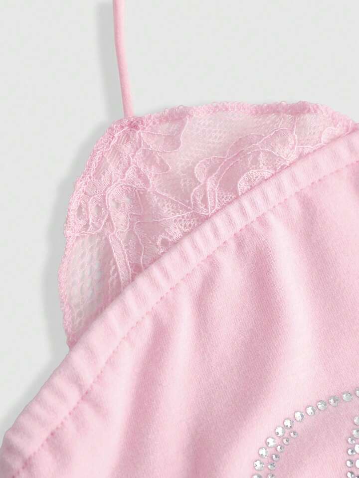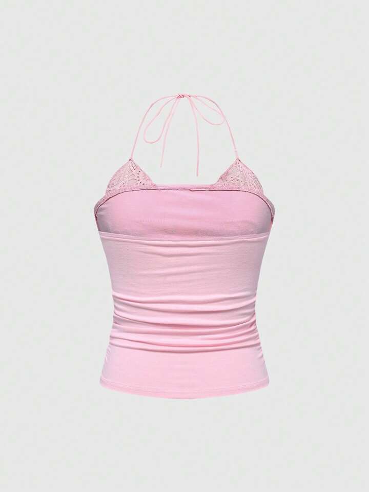 Women's 2 In 1 Rhinestone Lace Trim Halter Neck Drawstring Tank Top