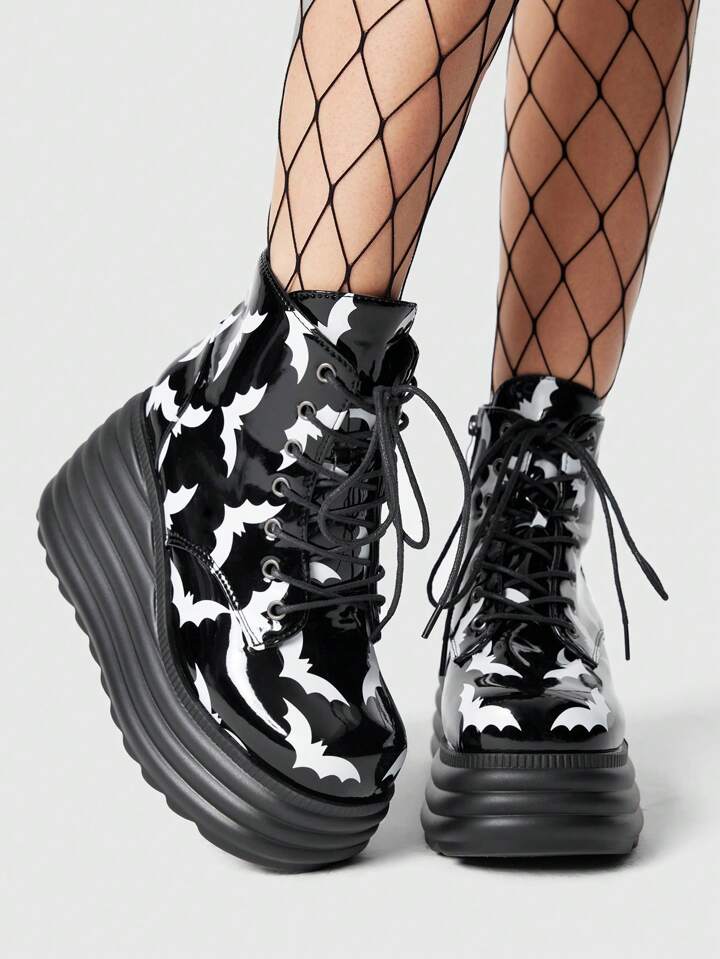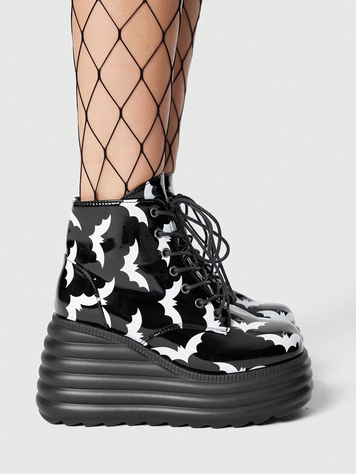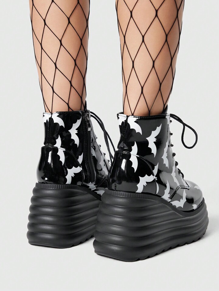 Women's Bat Print Round Toe Chunky Heel Platform Goth Punk PU Black Ankle Boots, For Everyday Wear, Rock, Street, Campus Style New Year Holiday