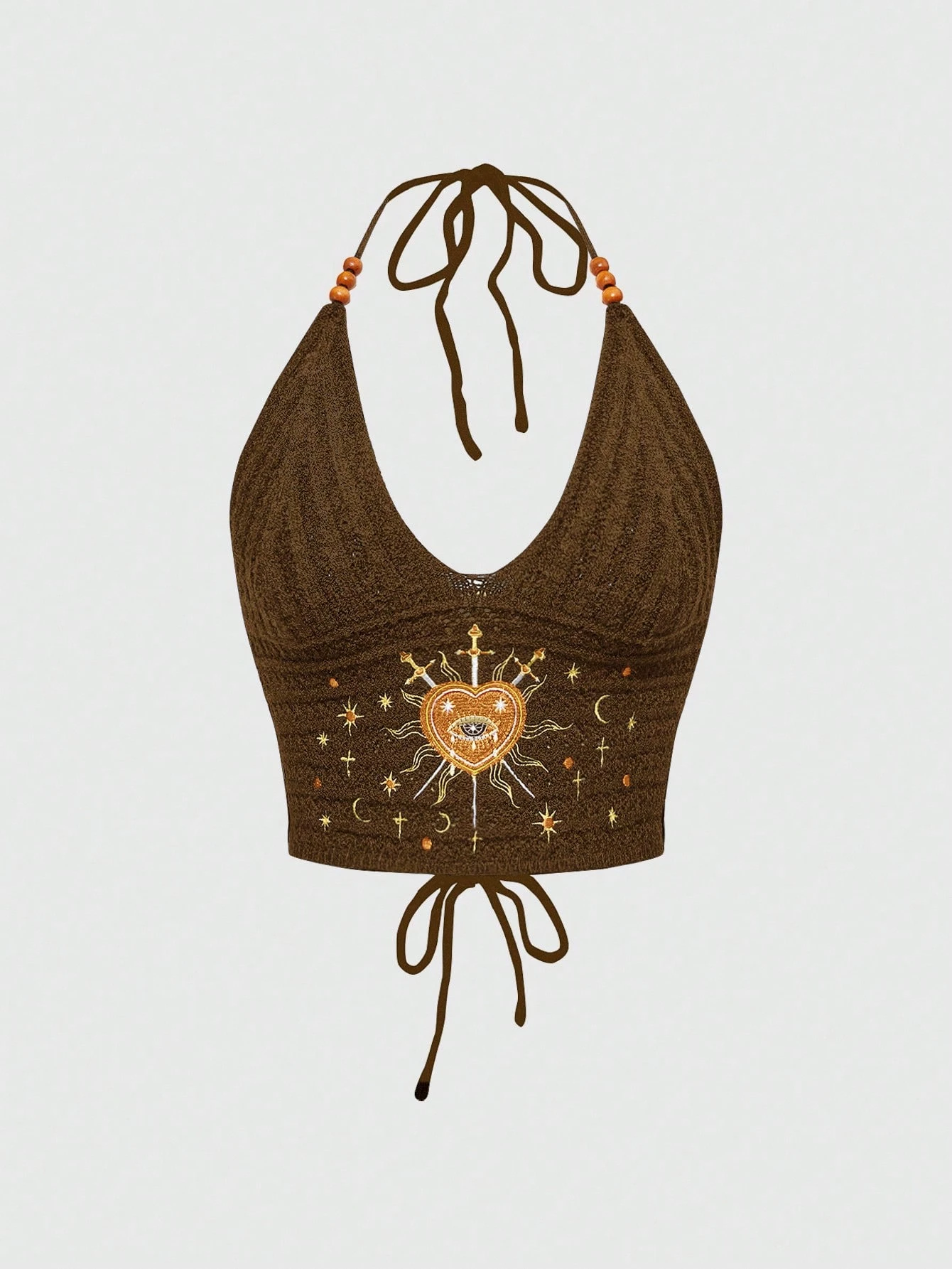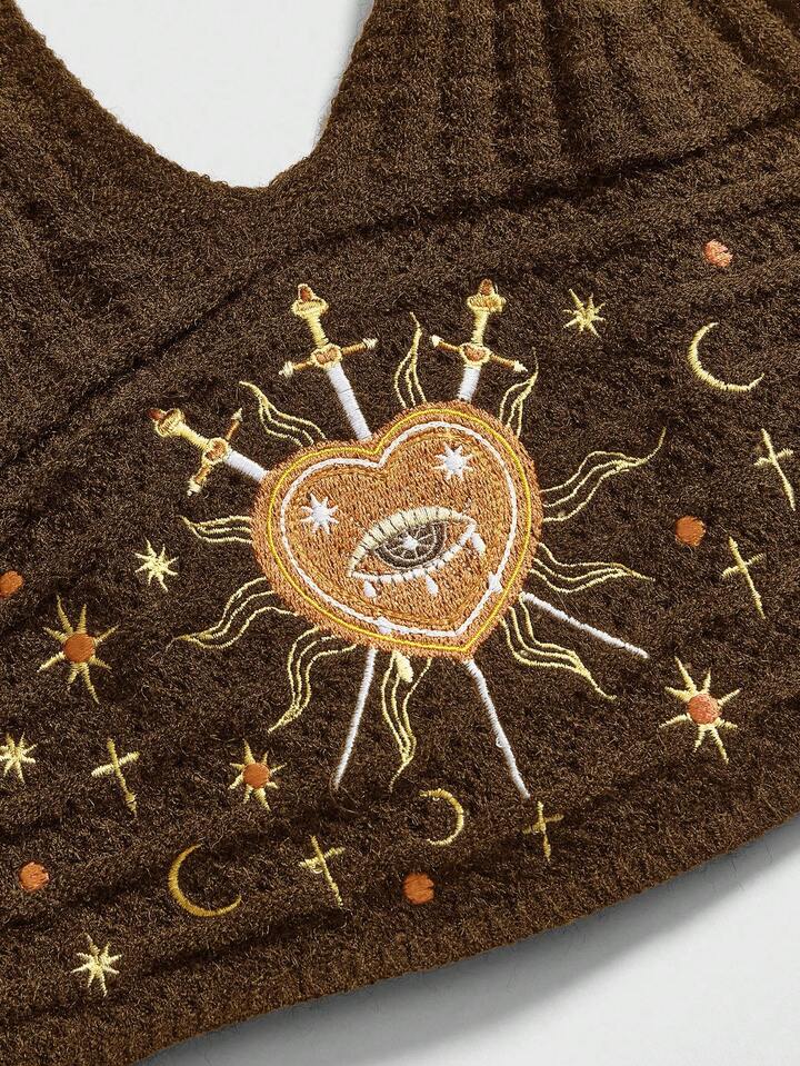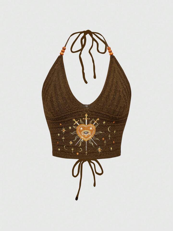 Women's Boho Gothic Hippie Vacation Style Heart Moon & Star Embroidery Black Knit Beaded Top