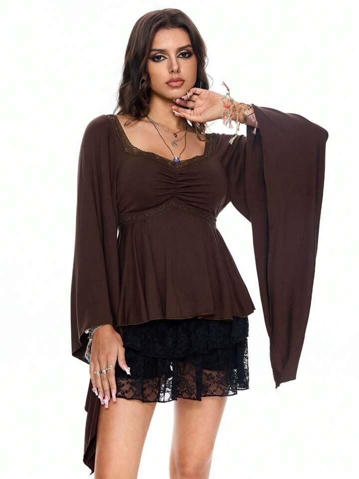 Women's Boho Style Hippie Solid Color Lace Patchwork Oversized Flare Sleeve A-Line T-Shirt