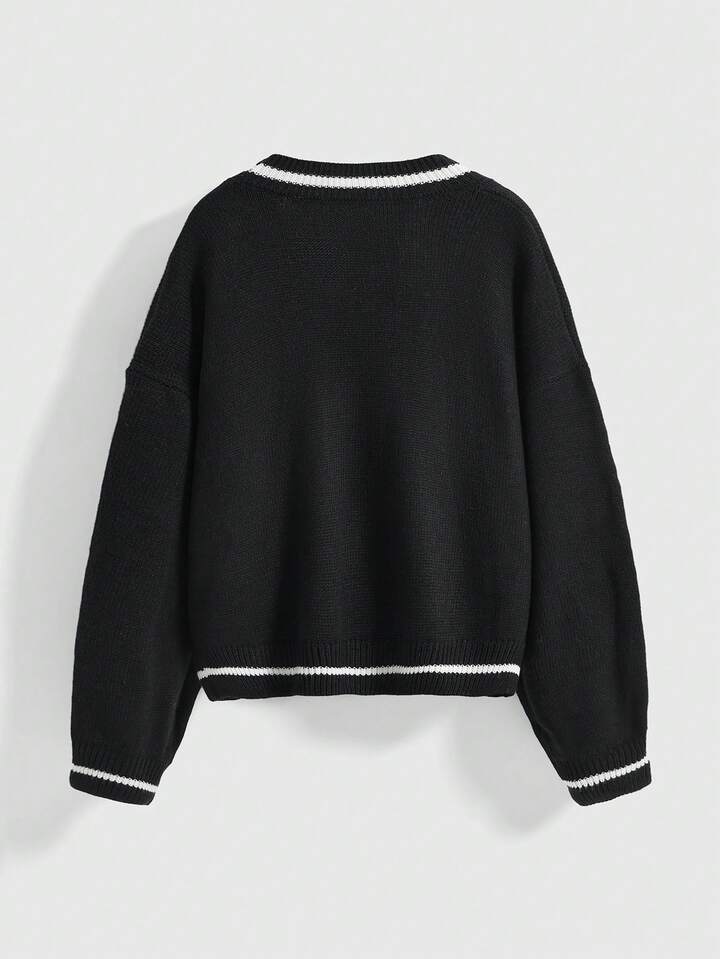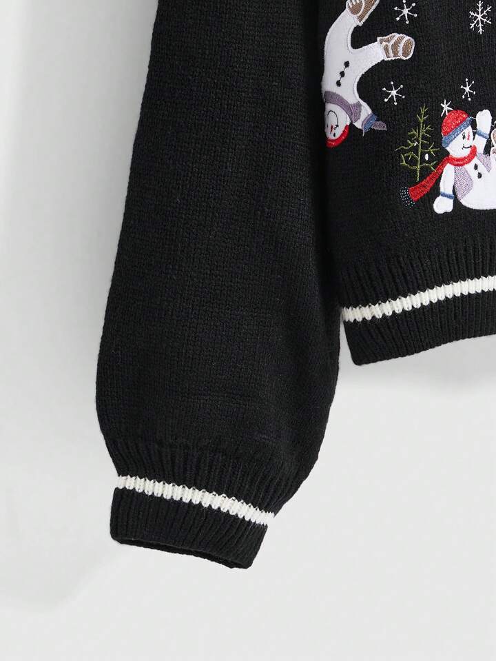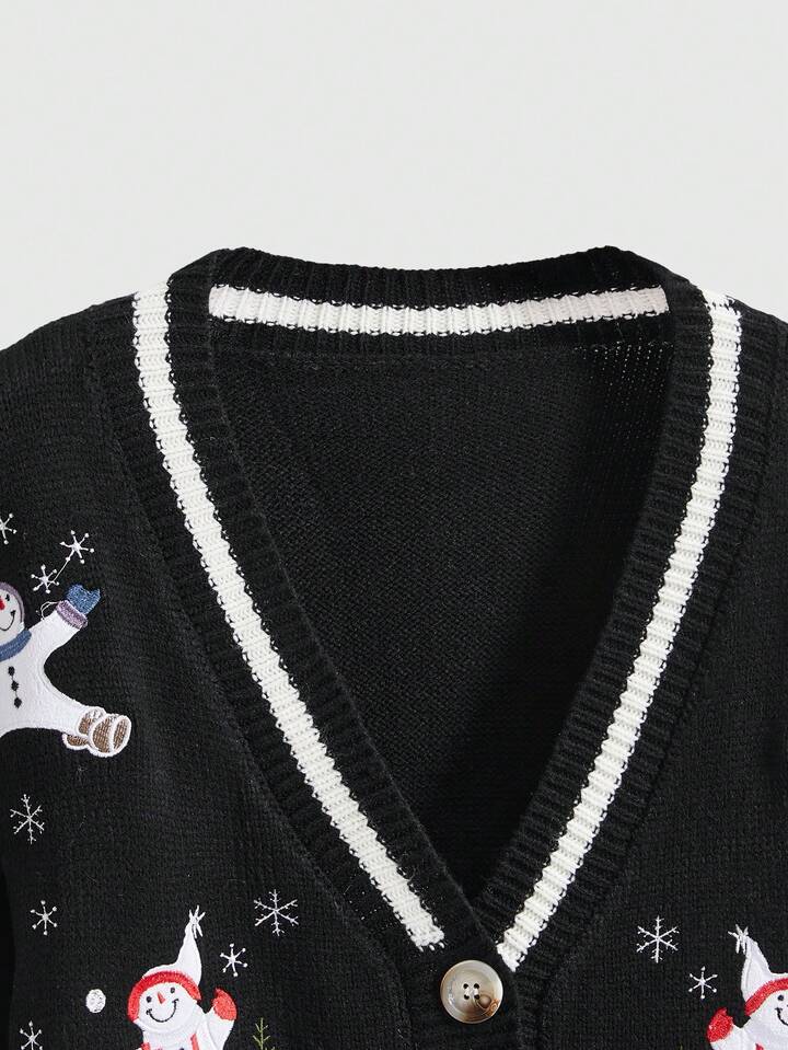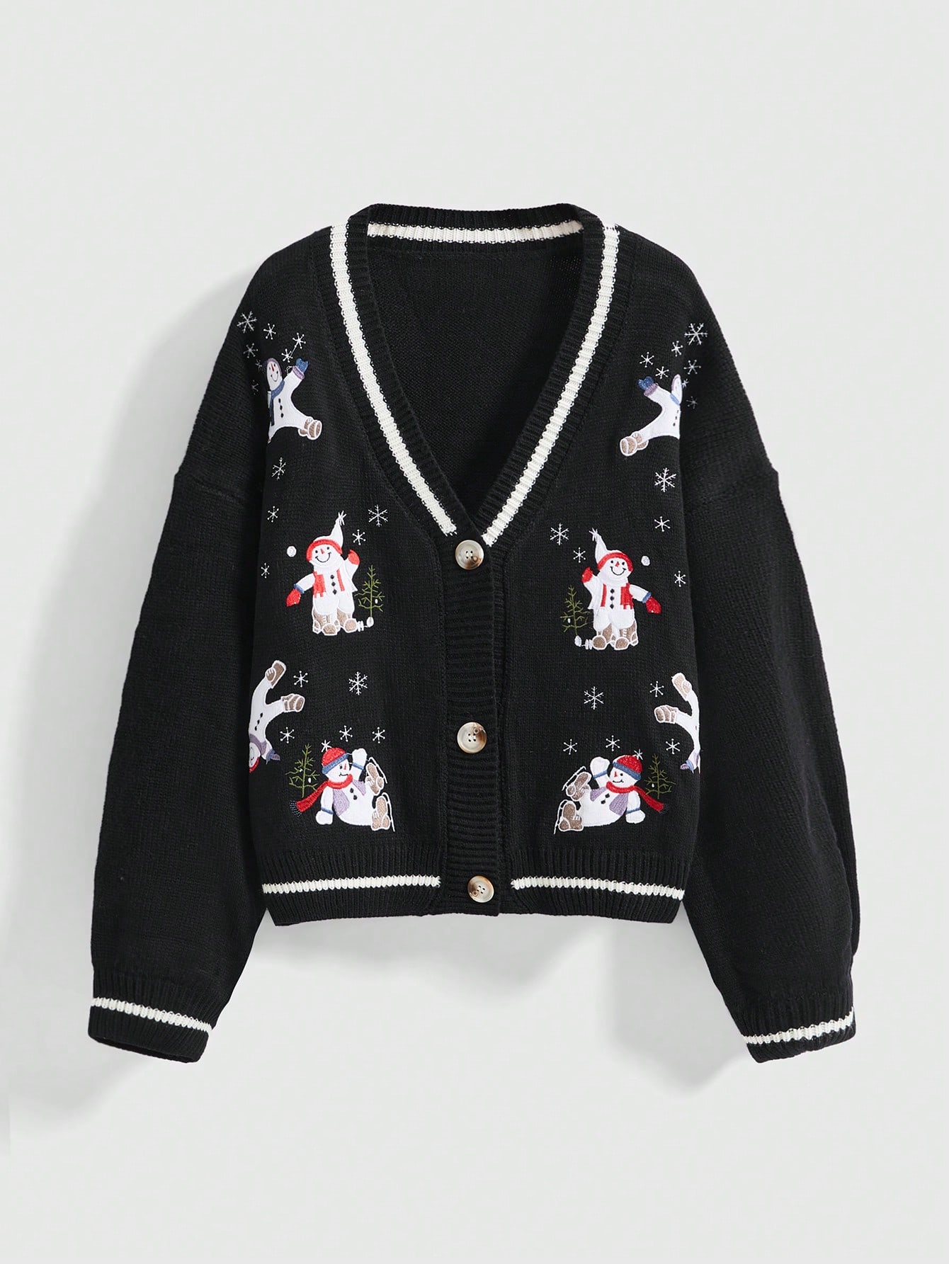 Women's Casual V-Neck Black & White Contrast Ribbed Christmas Snowman & Snowflake Embroidered Long Sleeve Cardigan Sweater