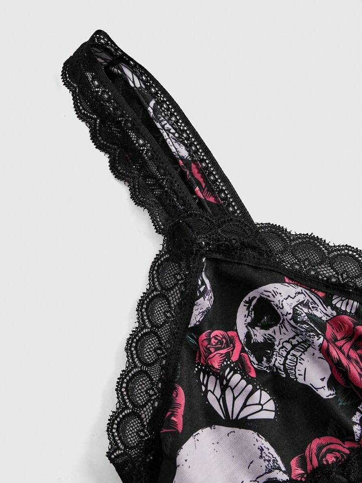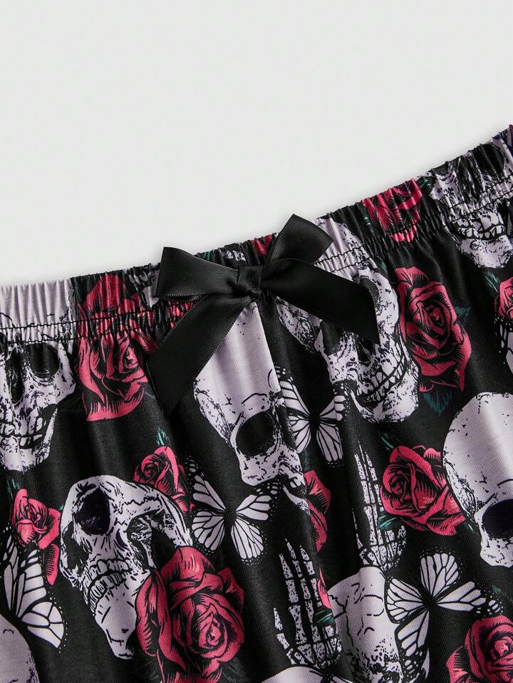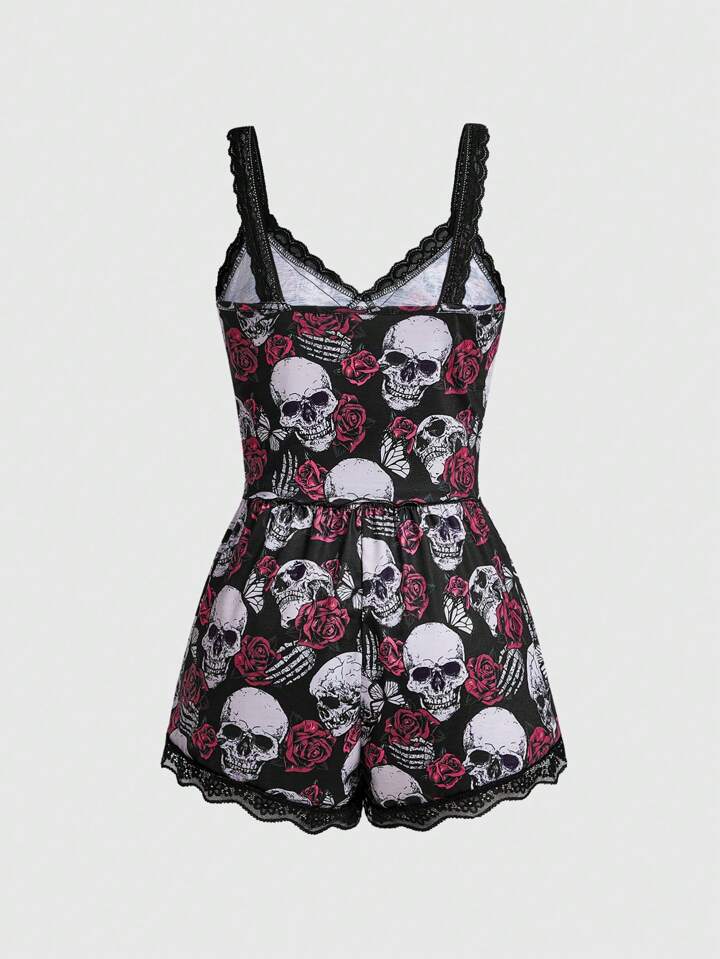 Women's Dark Goth Skull & Butterfly & Rose Digital Printed Splice Lace Trim Cami & Shorts Pajamas Set, School