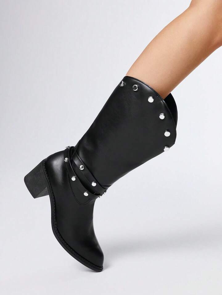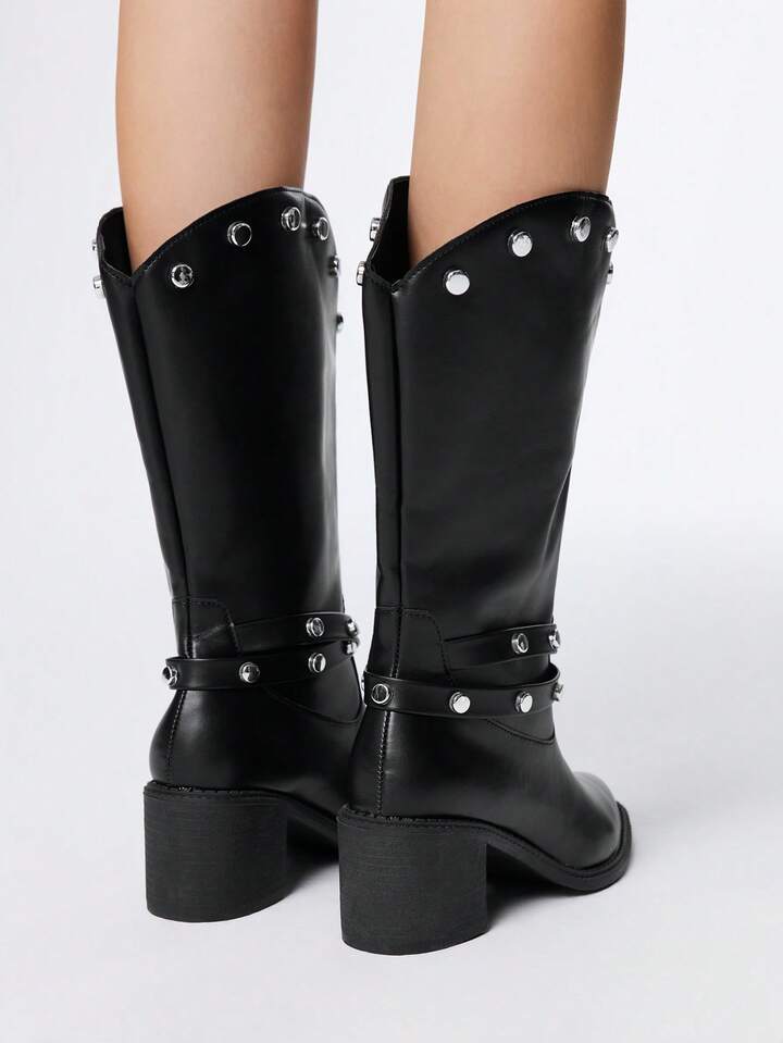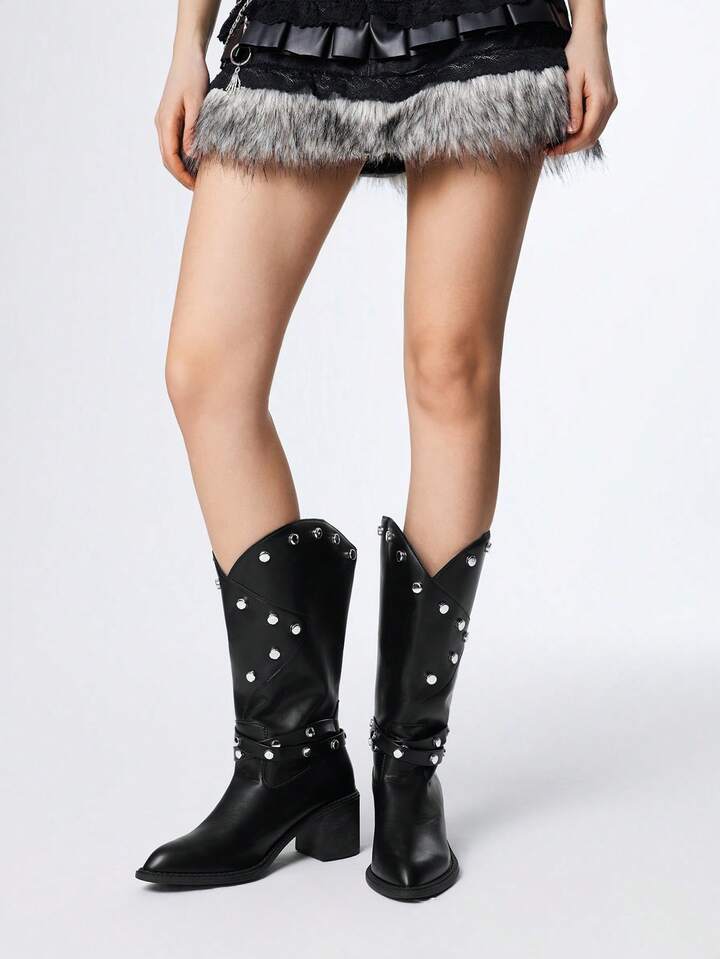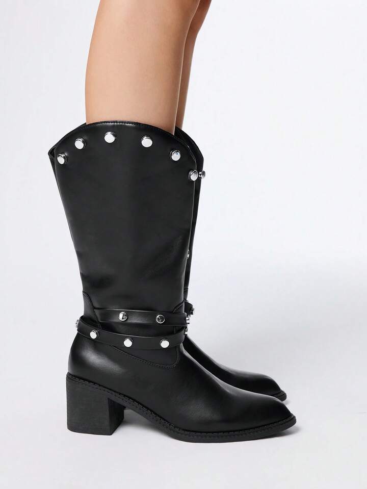 Women's Dark Rock Punk Goth Shoes, Black Leather Belt Buckle Rivet Motorcycle Boots, Leather Riding Knee-High Boots, Western Boots