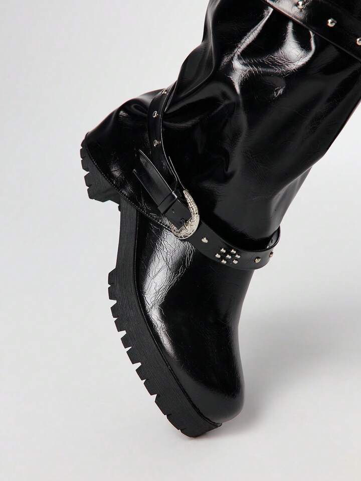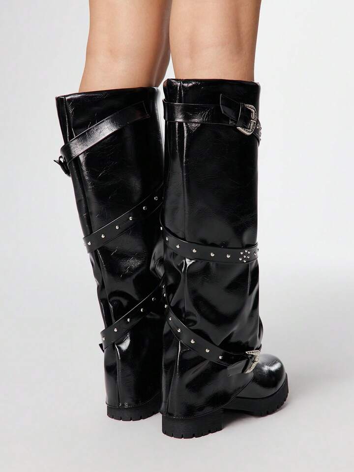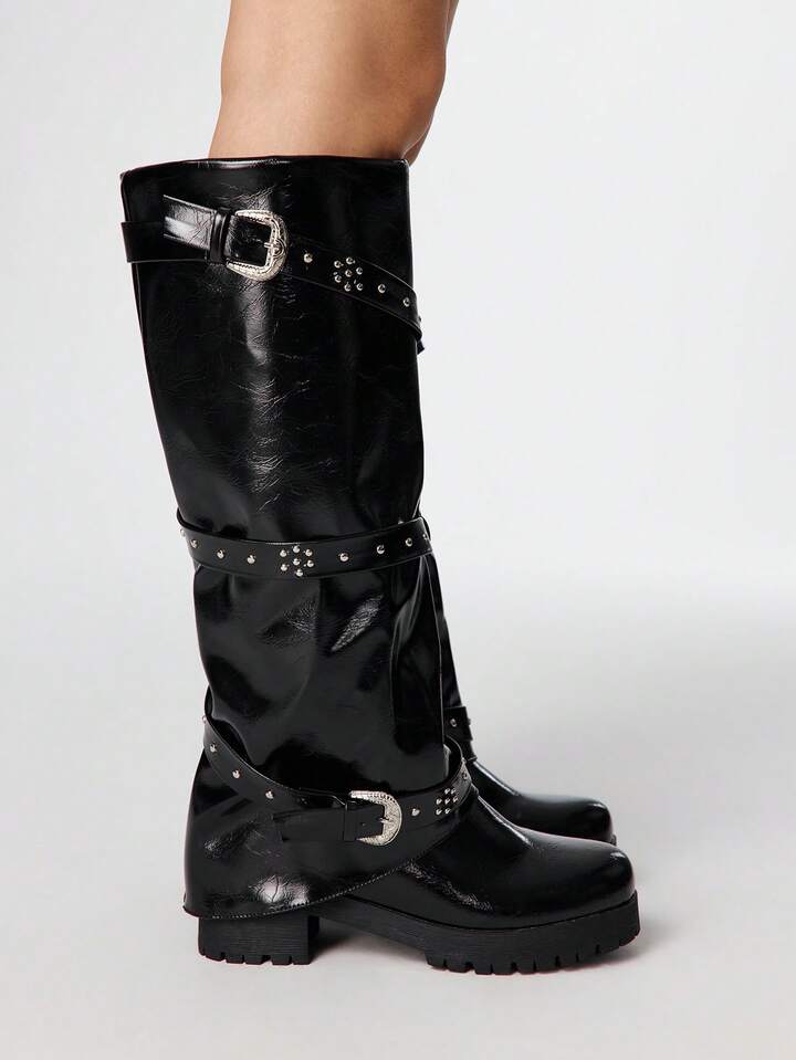 Women's Glossy Buckle Design Fashion Chunky Heel Knee-High Boots