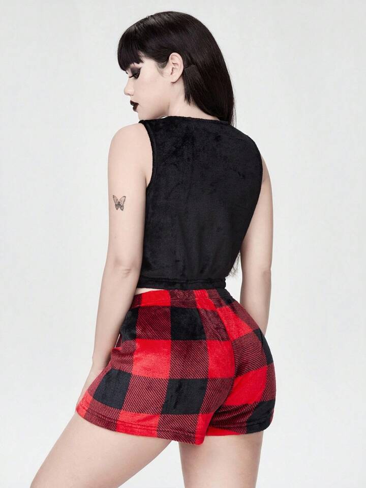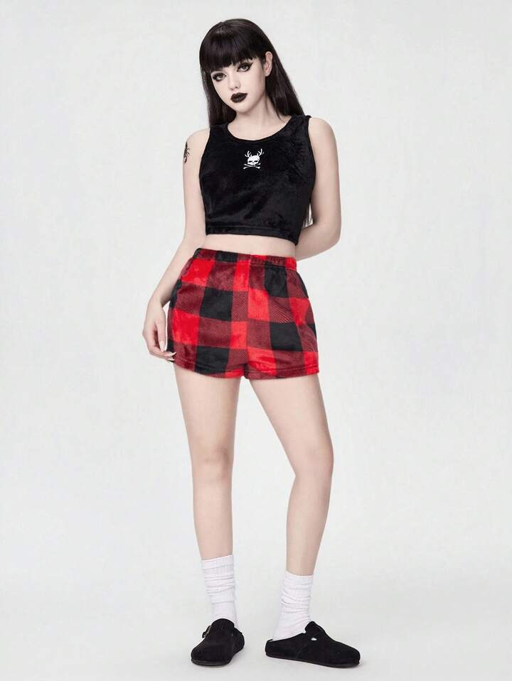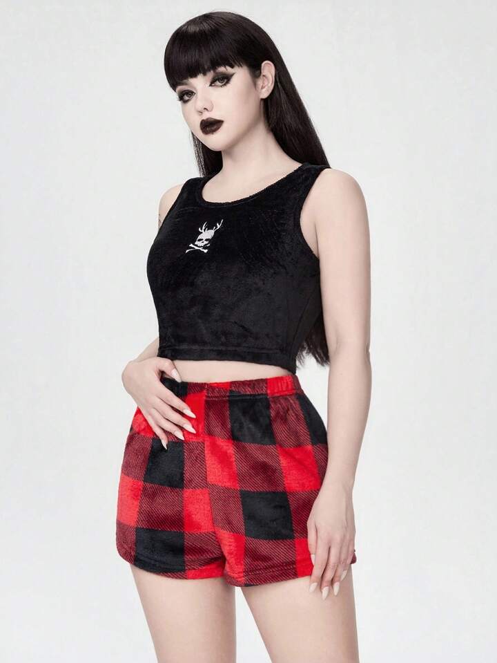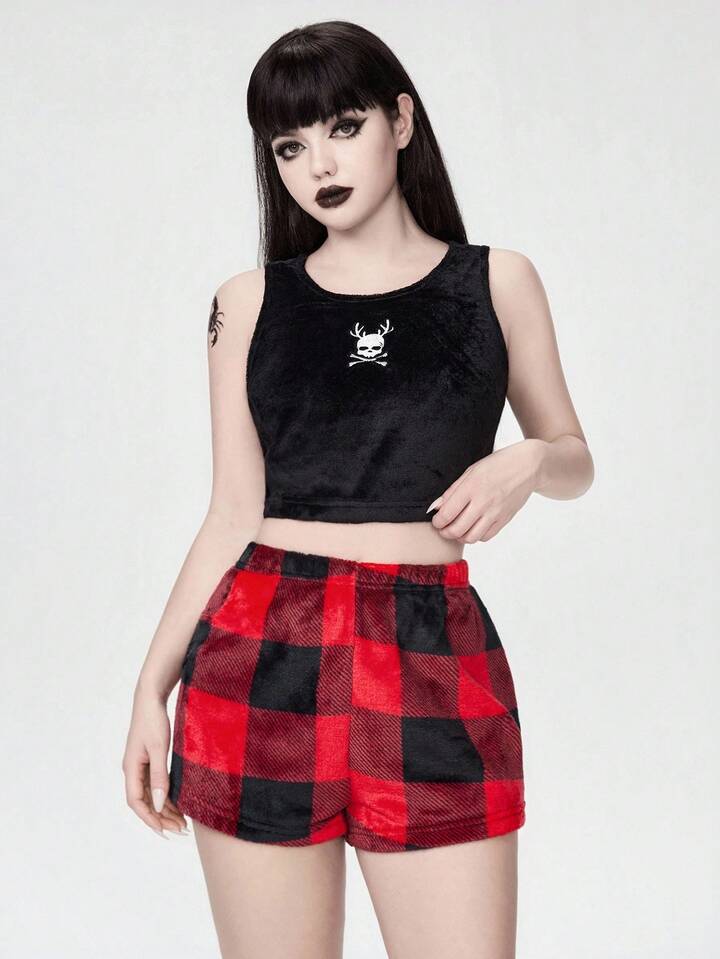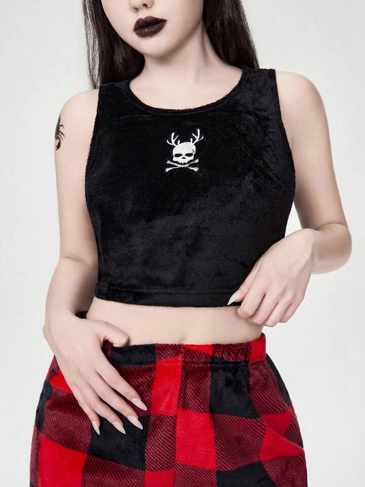 Women's Gothic Christmas Skeleton Deer Horn Flannel Embroidered Plaid Pajama Set