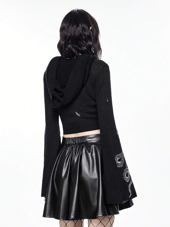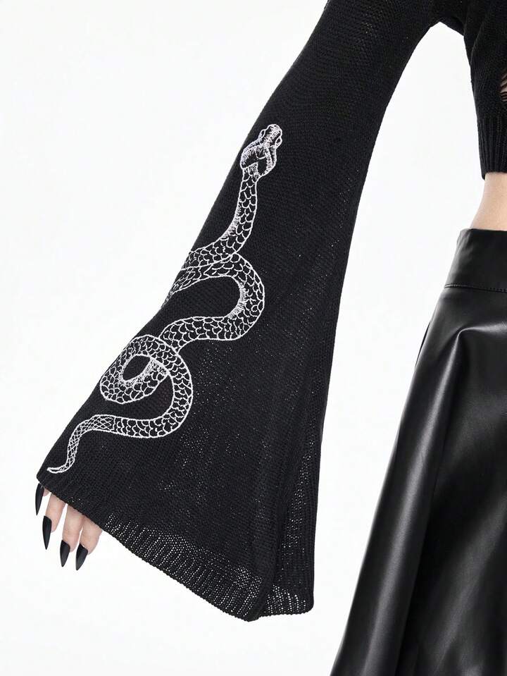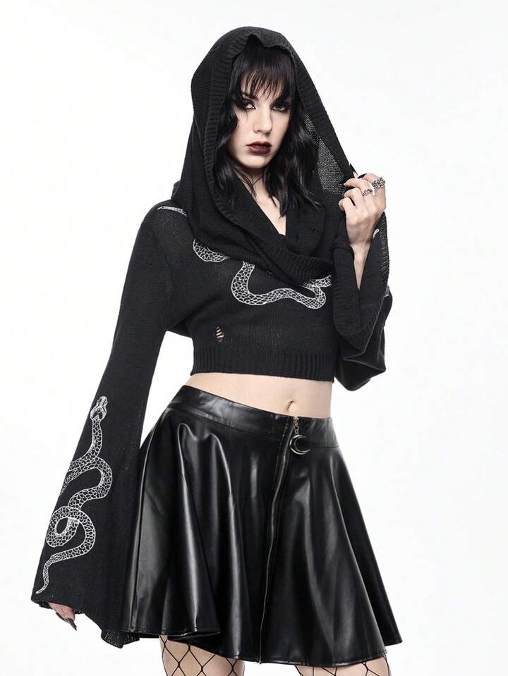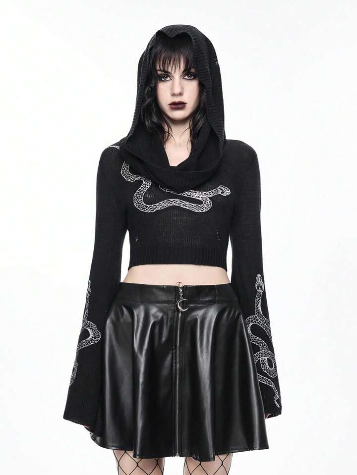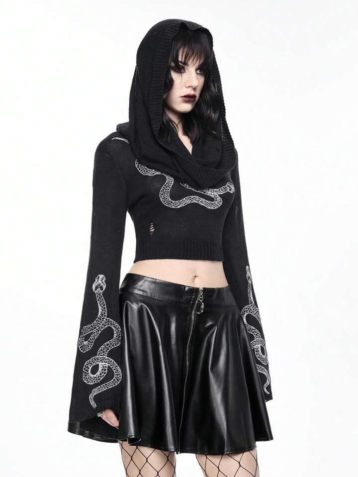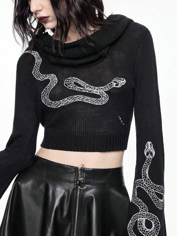 Women's Gothic Mysterious Snake Embroidery Flare Sleeve Hooded Knit Pullover Top