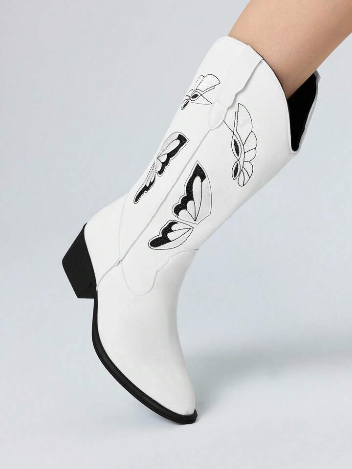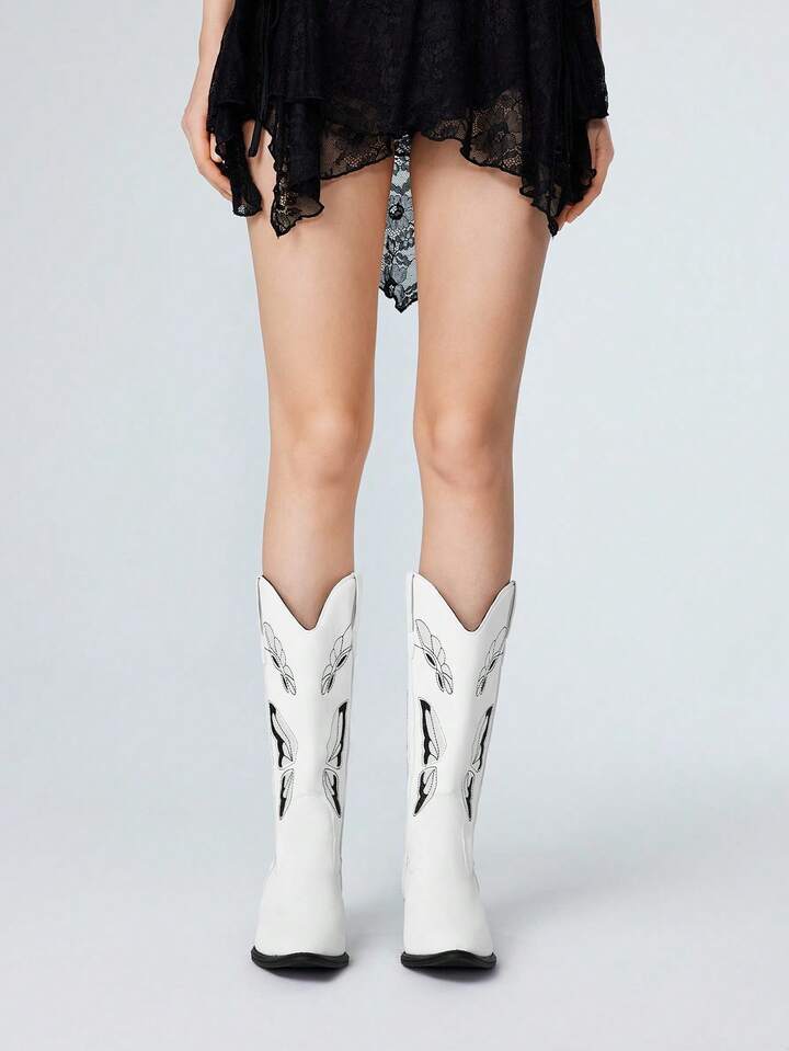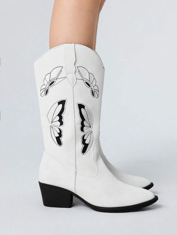 Women's Gothic Punk White Embroidery V-Cut Butterfly Western Mid-Calf Thick Heel Boots, Halloween