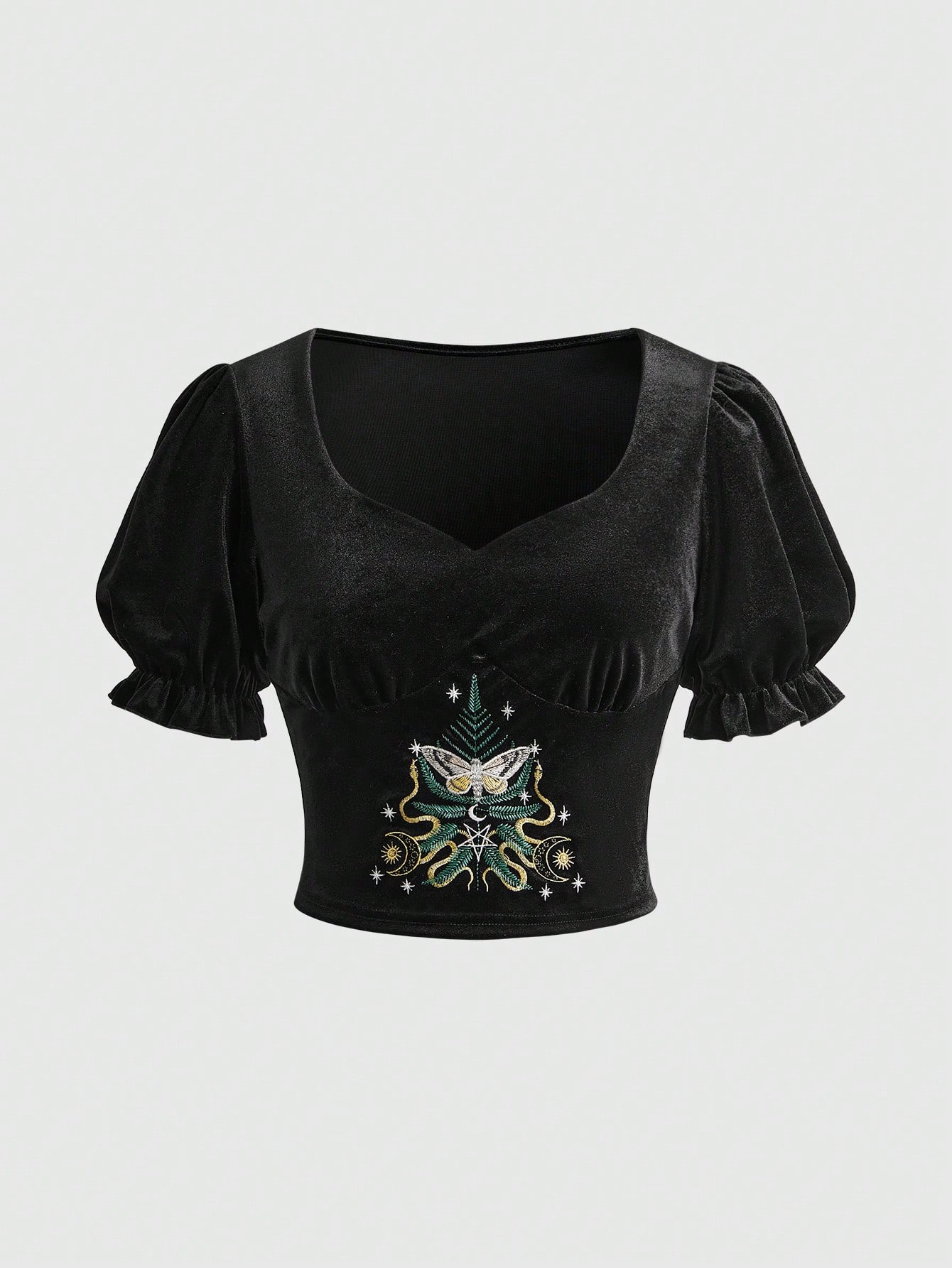 Women's Gothic Velvet Puff Sleeve Butterfly Embroidery Blouse