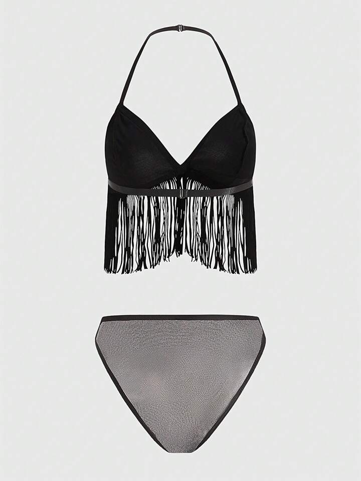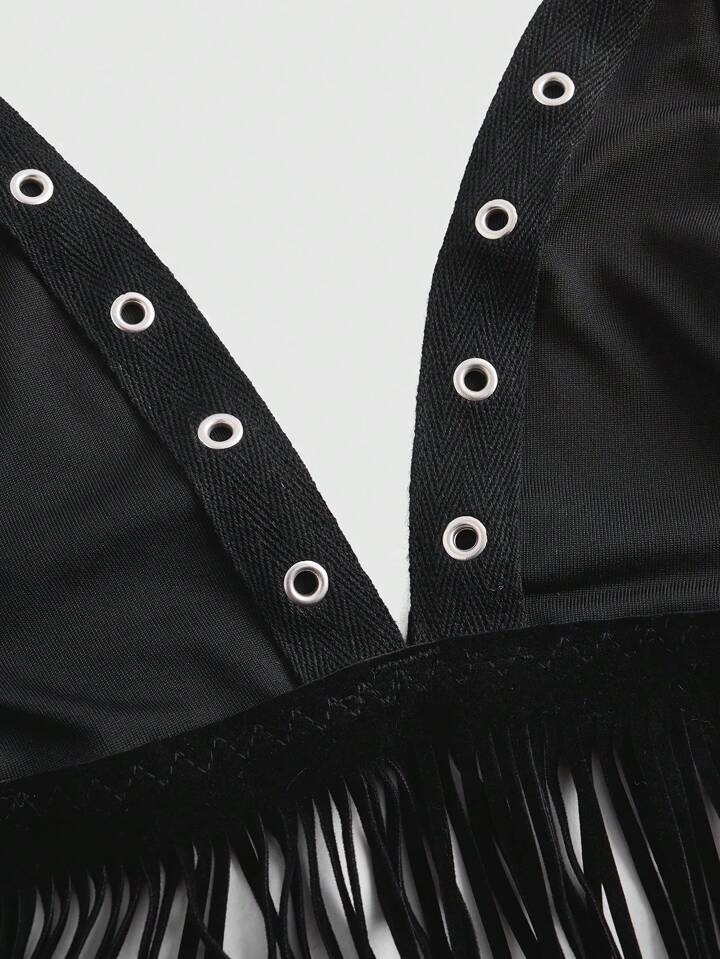 Women's Halterneck Lace Bralette And Triangle Panties Set With Fringe Tassel Details,Boo Goth Style
