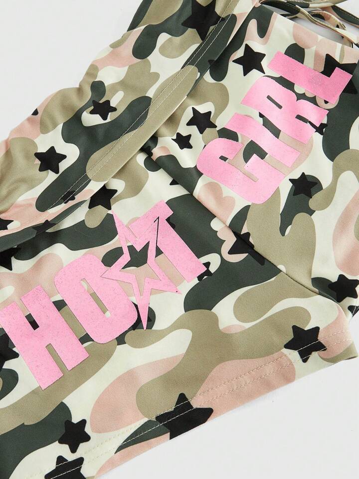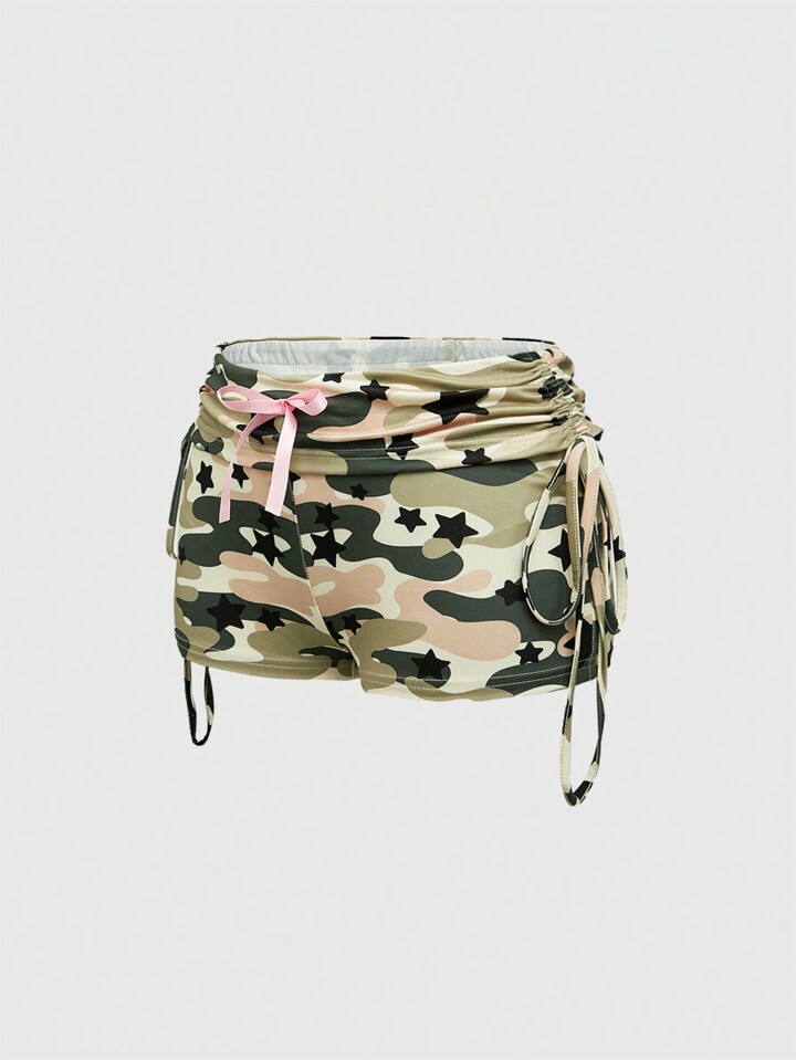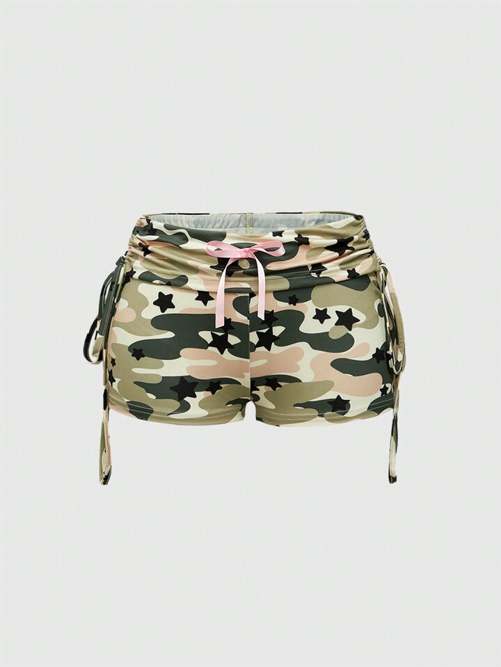 Women's Low Waist Ultra-Short Drawstring Camouflage Five-Pointed Star & Letter Print Shorts