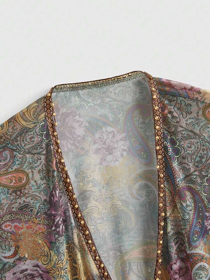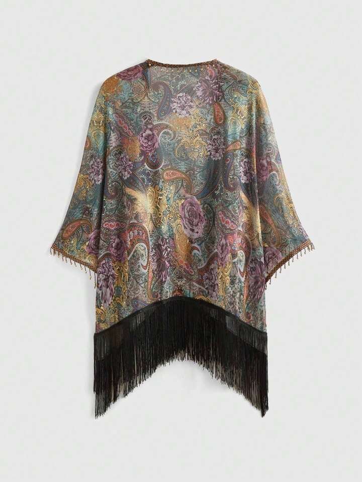 Women's Retro Hippie Western Cowgirl Paisley Print Asymmetrical Fringe Hem Cardigan Top, Sleeveless