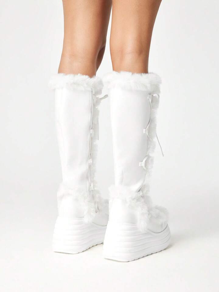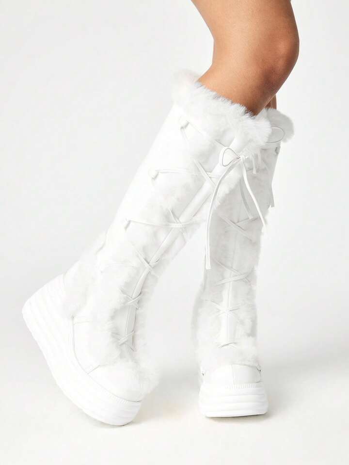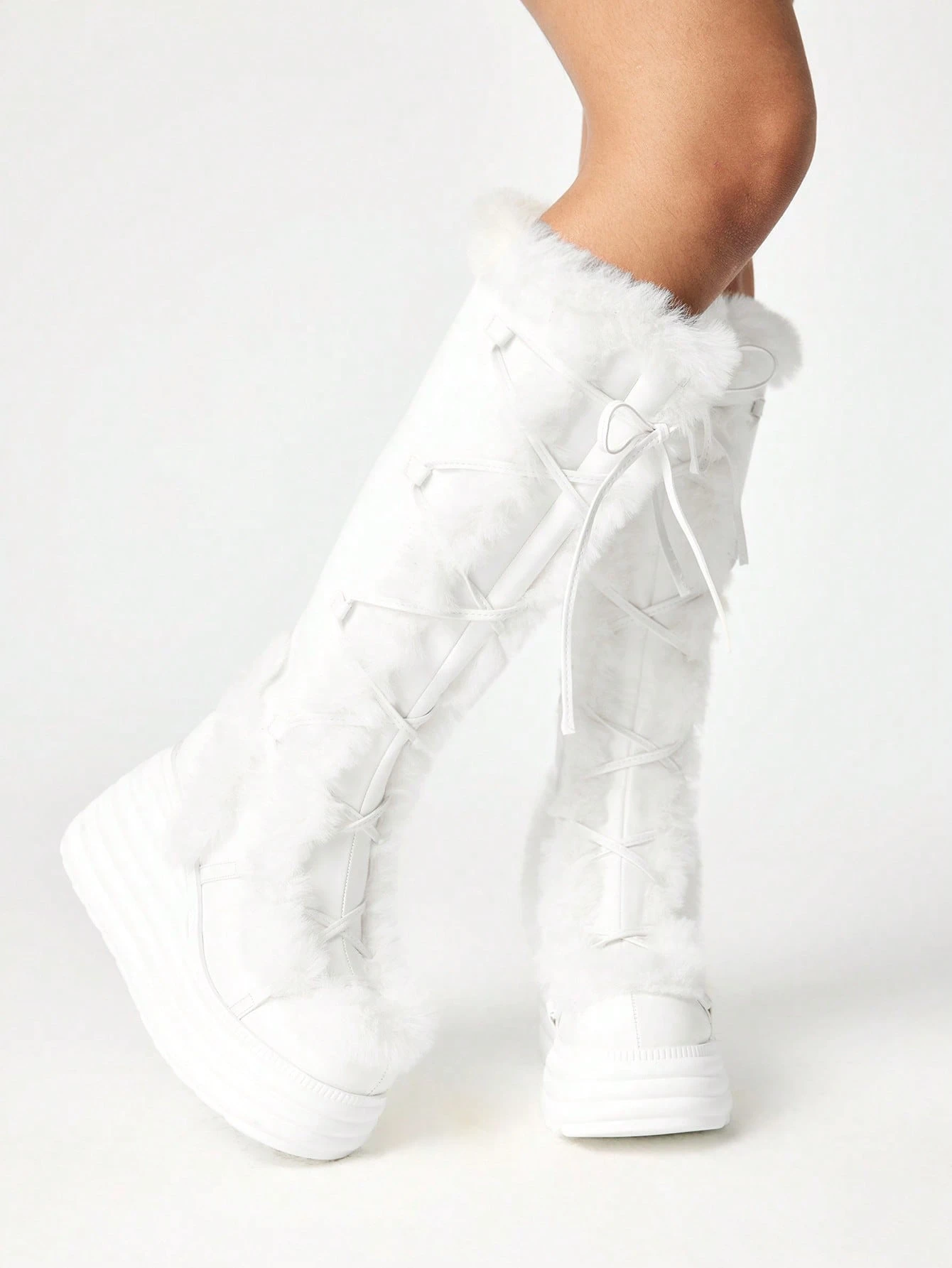 Women's Round Toe Punk Lace-Up Side Zipper Platform Thick Sole Boots With Fur Lining, Outdoor Fashion Over-The-Knee Boots, Autumn/Winter New Arrival For Christmas