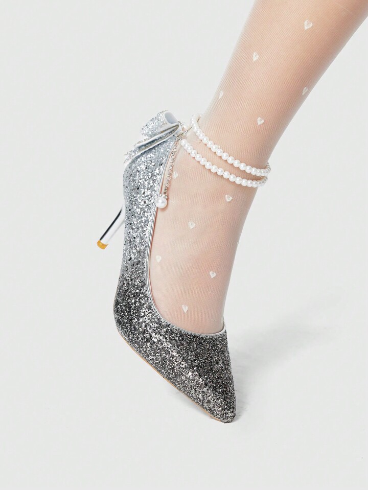 Women's Silver High Heels, Sexy Gradient Crystal Rhinestone Glitter Shoes For Bride Wedding Formal Dress, Office Work Party Pointed Toe Pumps Valentine's Day