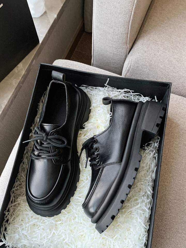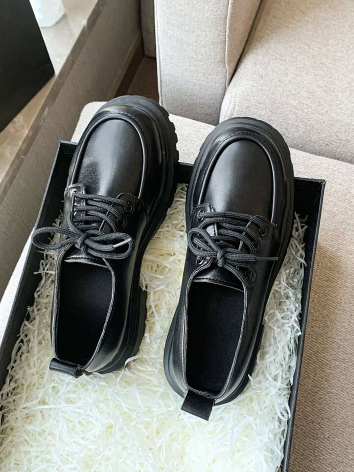 Women's Thick Sole Oxford Shoes, British Style Mary Jane Flats, Lace-Up, Black, Spring/Autumn