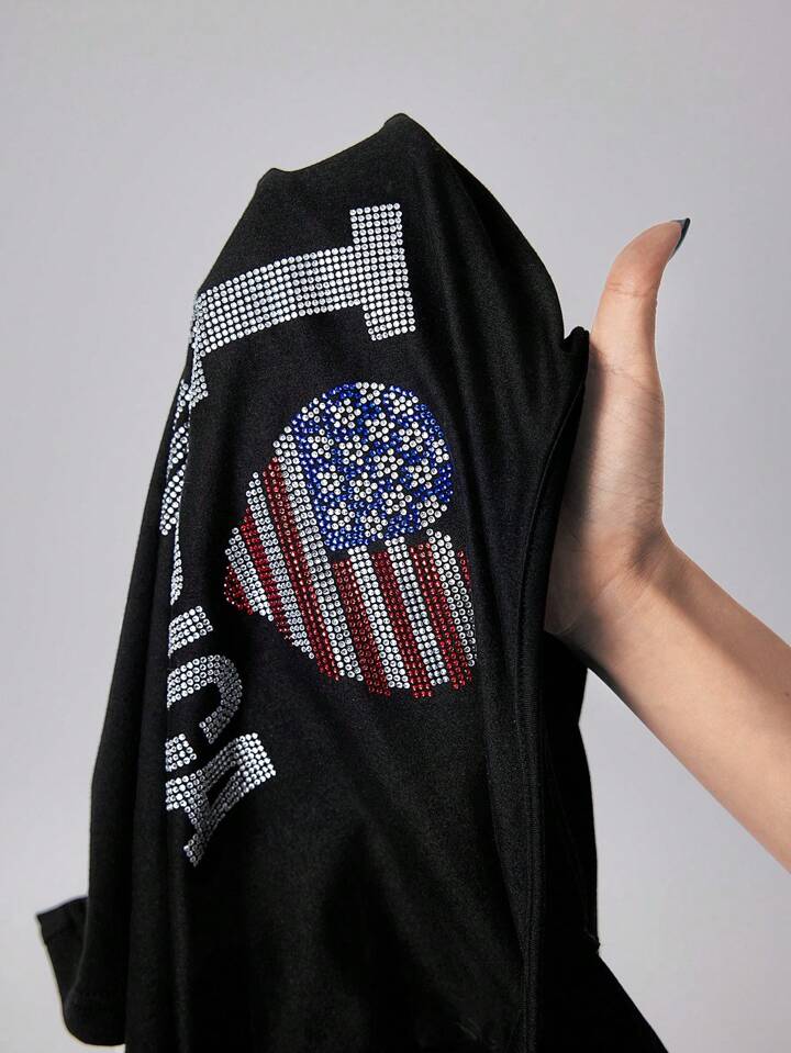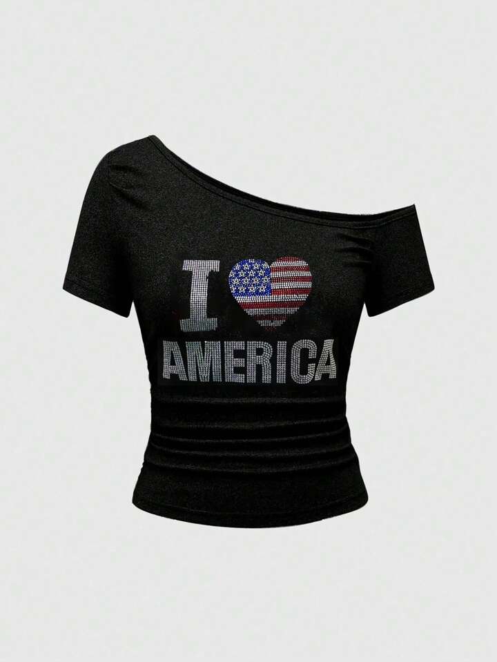Women's Y2K Style I Love USA American Flag Heart Crystal Embellished Slim Fit Sexy T-Shirt