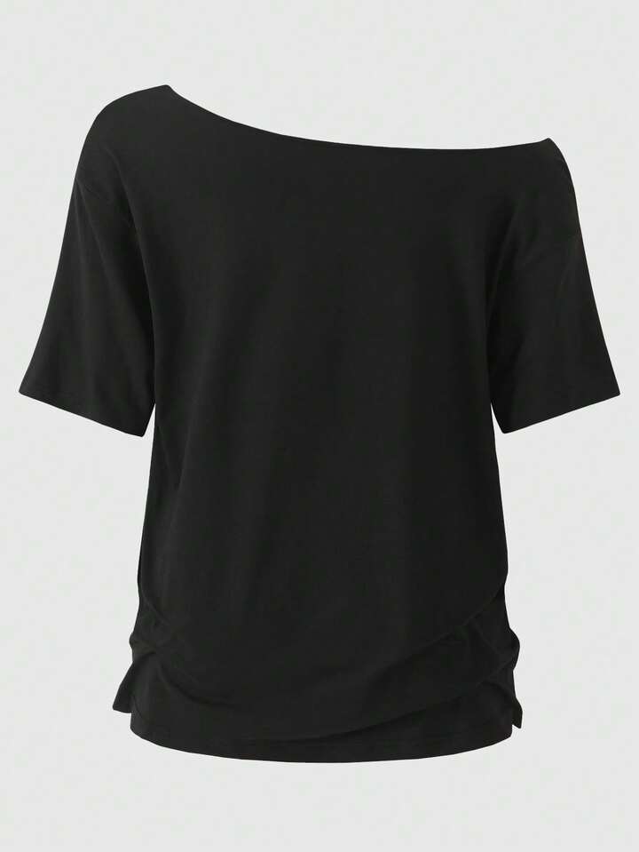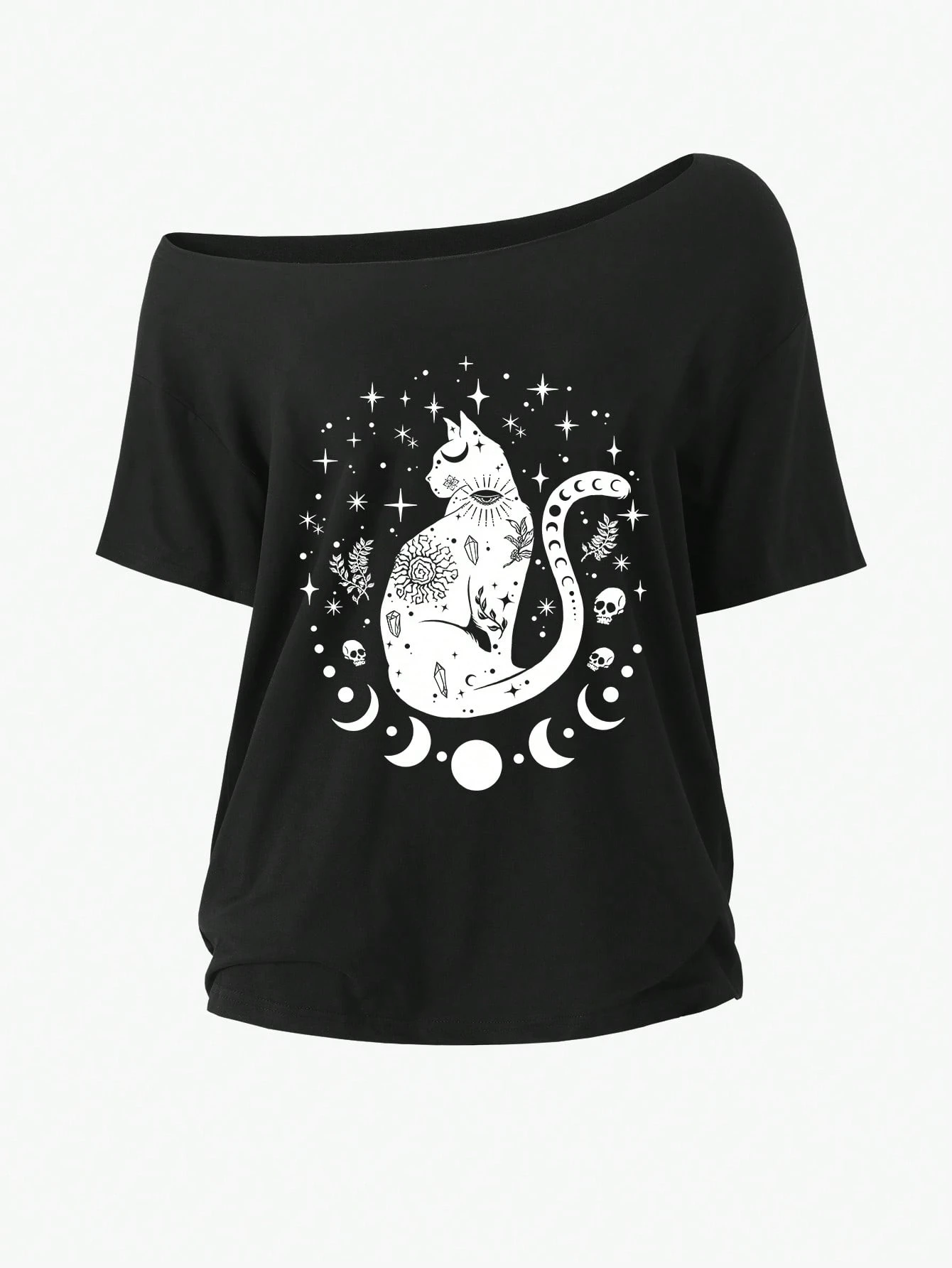 Y2K Cute Nature Goth Mysterious Sun Moon Stars Asymmetric Shoulder Black Floral Print Women T-Shirt