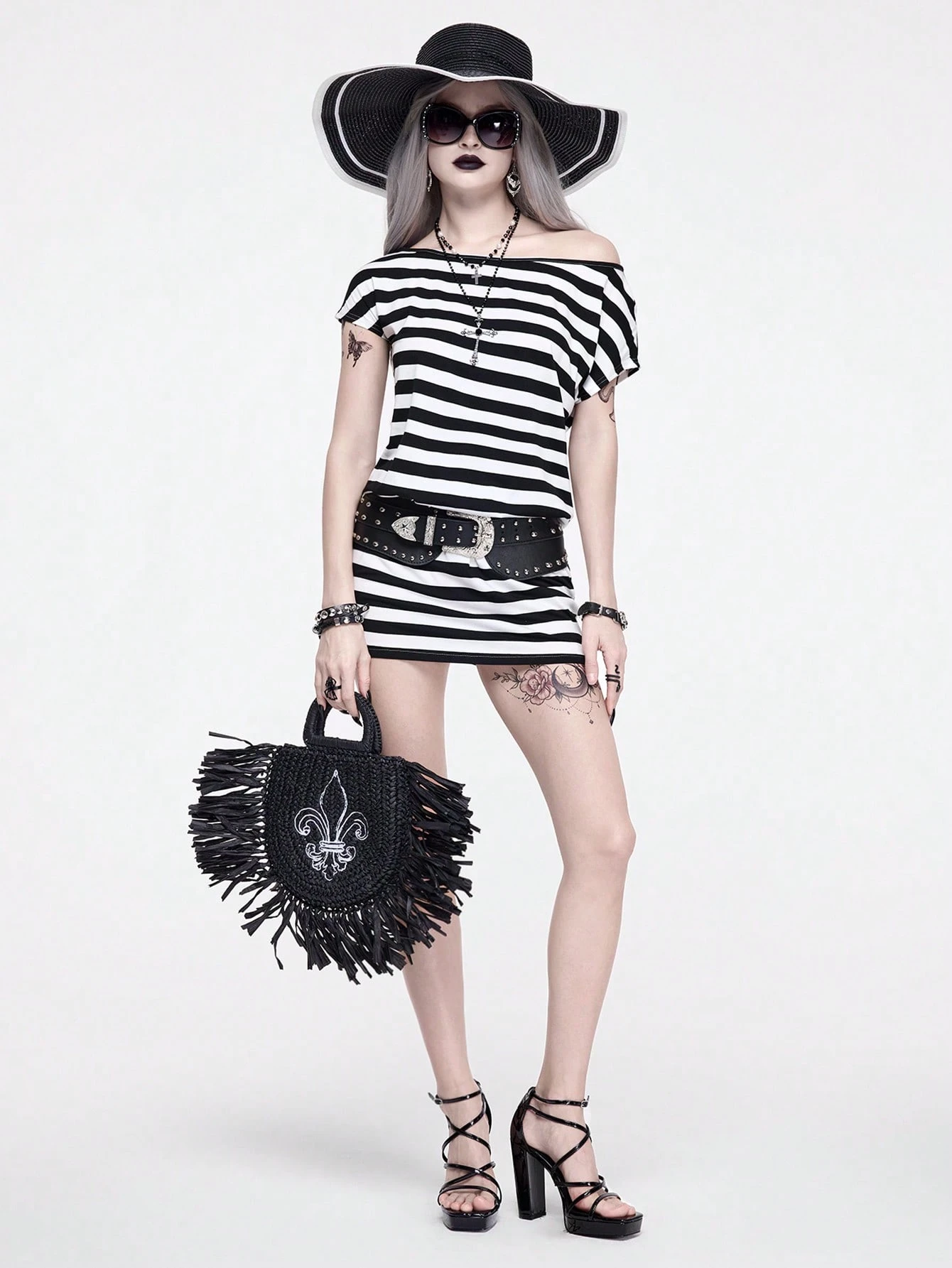 Y2K Gothic Casual Vacation Striped Asymmetric Strap Mini Bodycon Dress For Women