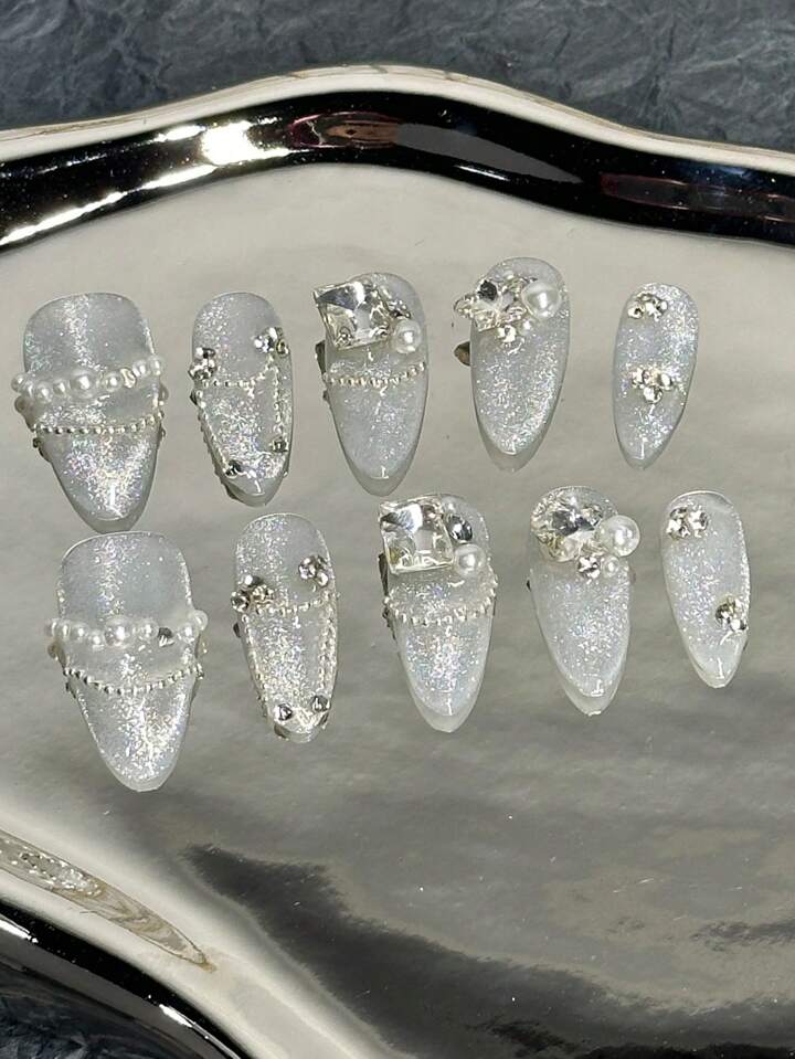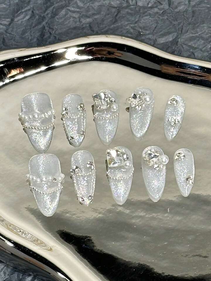 (in Stock) 10pcs/set Almond Shaped Cat Eye & Snowflake False Nails With Jelly Glue