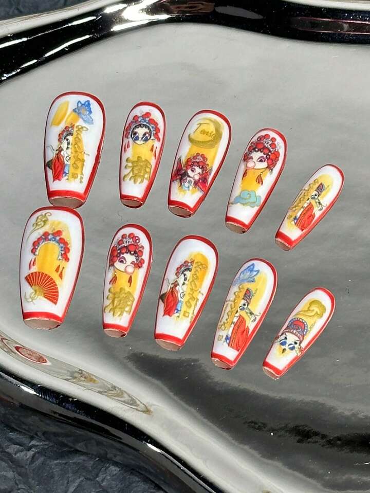 (in-stock) 10pcs/set Long Nail Matte Finish Chinese Style Fake Nails With Jelly Glue