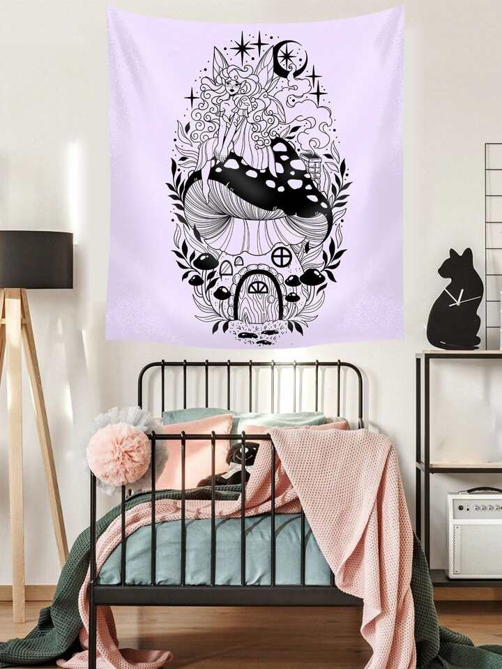 texdoodles Cartoon Figure & Mushroom Print Decorative Tapestry