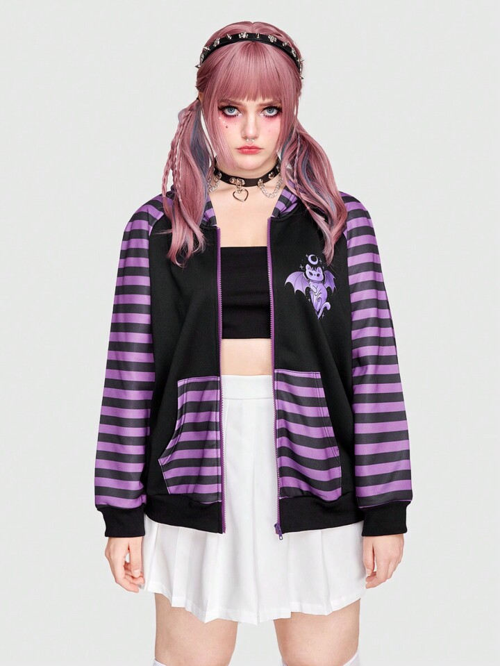 texdoodles Plus Size Cartoon Cat Patchwork Striped Zip Front Hoodie