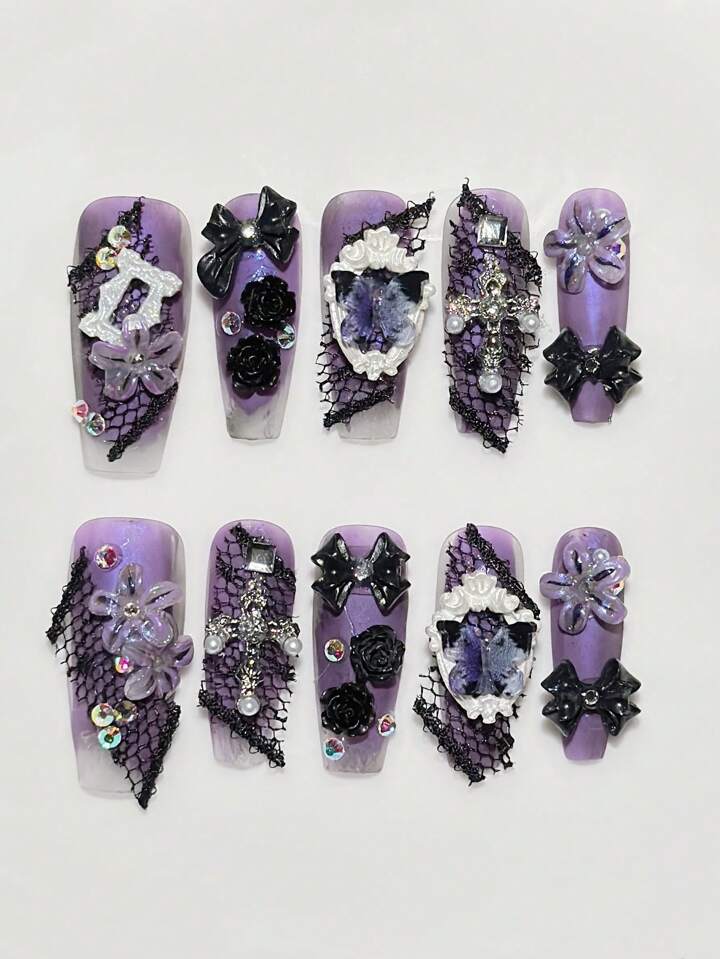 10 Stück dunkle gothische lila Blumen Nagel Sticker + 3 Stück doppelseitiger Klebstoff, abnehmbare handbemalt elegante Nagelkunst Aufkleber mit 3D Blumen- und Schleifen-Dekorationen, hochglänzend, künstliche Aufklebe-Fingernägel geeignet für Festivals, Partys, Tanzen und den täglichen Gebrauch