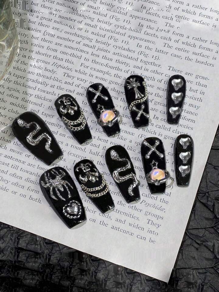 Goth 10 Stücke extra lange Stiletto Vollabdeckung Kunstnägel Set, gotische Spinne und herzförmige Strassdekoration, rein handgemachte und entfernbare Nagelspitzen mit Jelly-Kleber