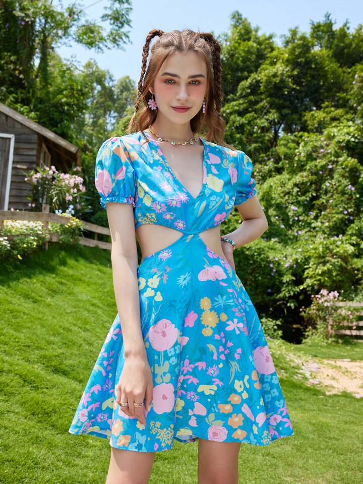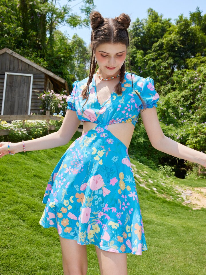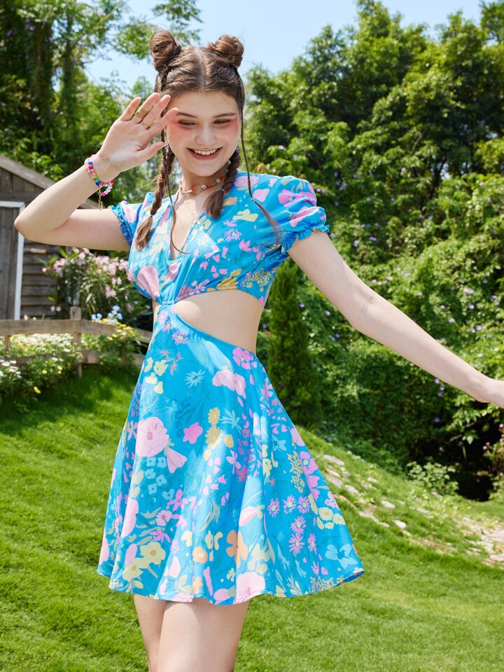 1 Stück Kleid mit Blume Muster, Ausschnitt, Kreuzgurt auf Rücken