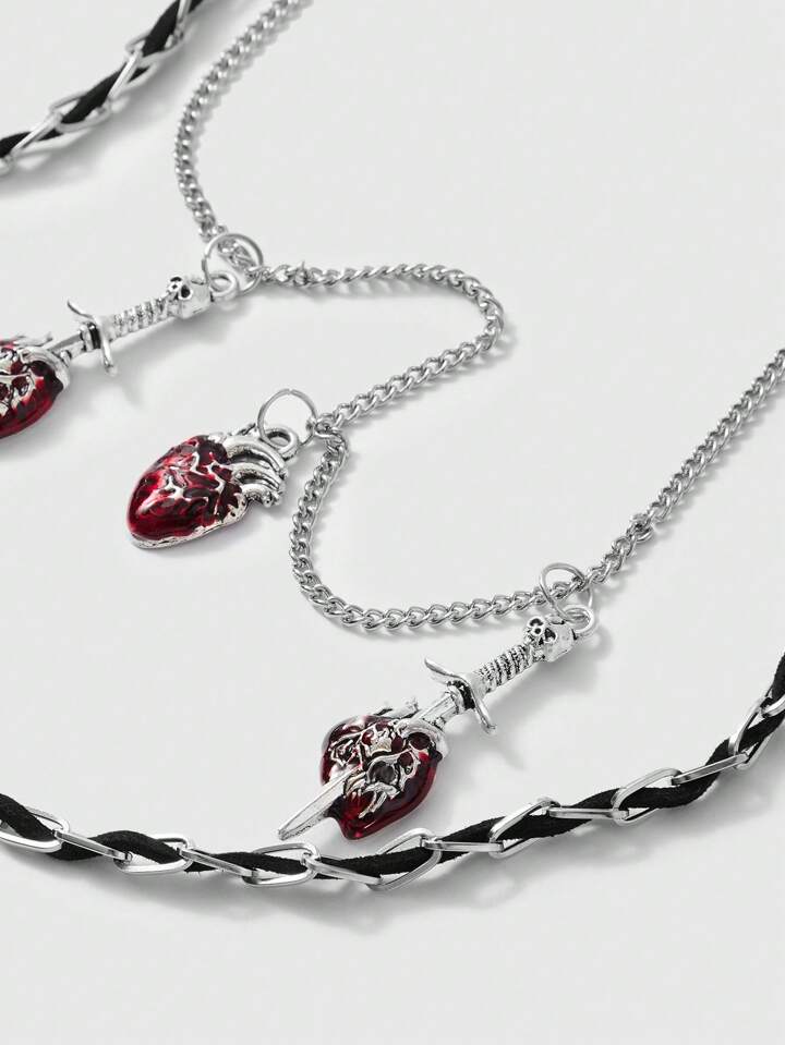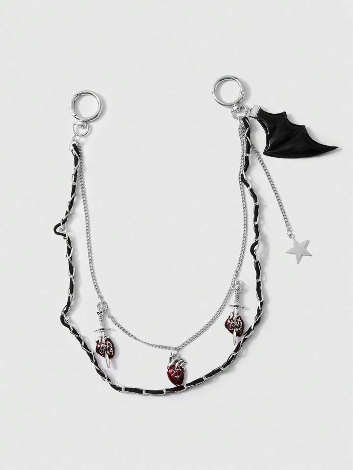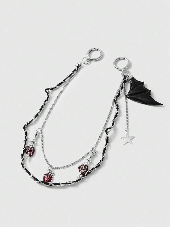 1 Stück Gothic Punk Stil silberne Cut Out Kette mit rotem Herz Schädel Pfeil Anhänger mit schwarzem Samt und Leder Flügel Hüftkette, geeignet für Frauen, modisches Accessoire und Geschenk