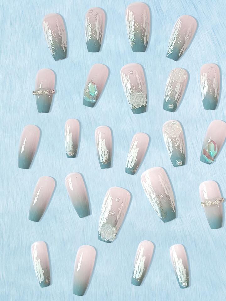 24 Stücke Sarg Kunstnägel mit 3D Blume Dekor & 1 Blatt Band