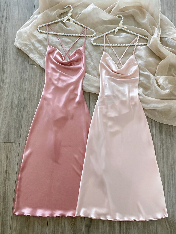 2 Stück Satin Träger Nachthemd mit drapiertem Kragen, luxuriöse Loungewear