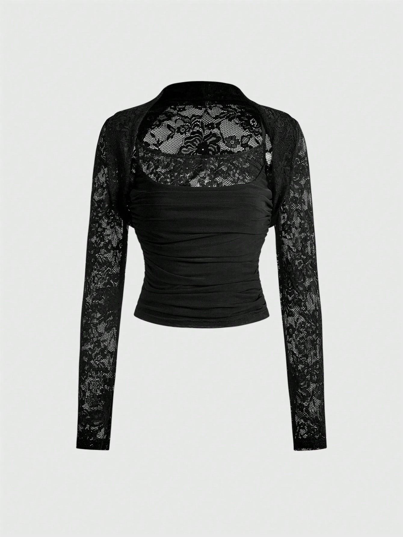 2 Stück/Set Mesh & Spitze Trägerhemd und kurze Spitzen Bolero