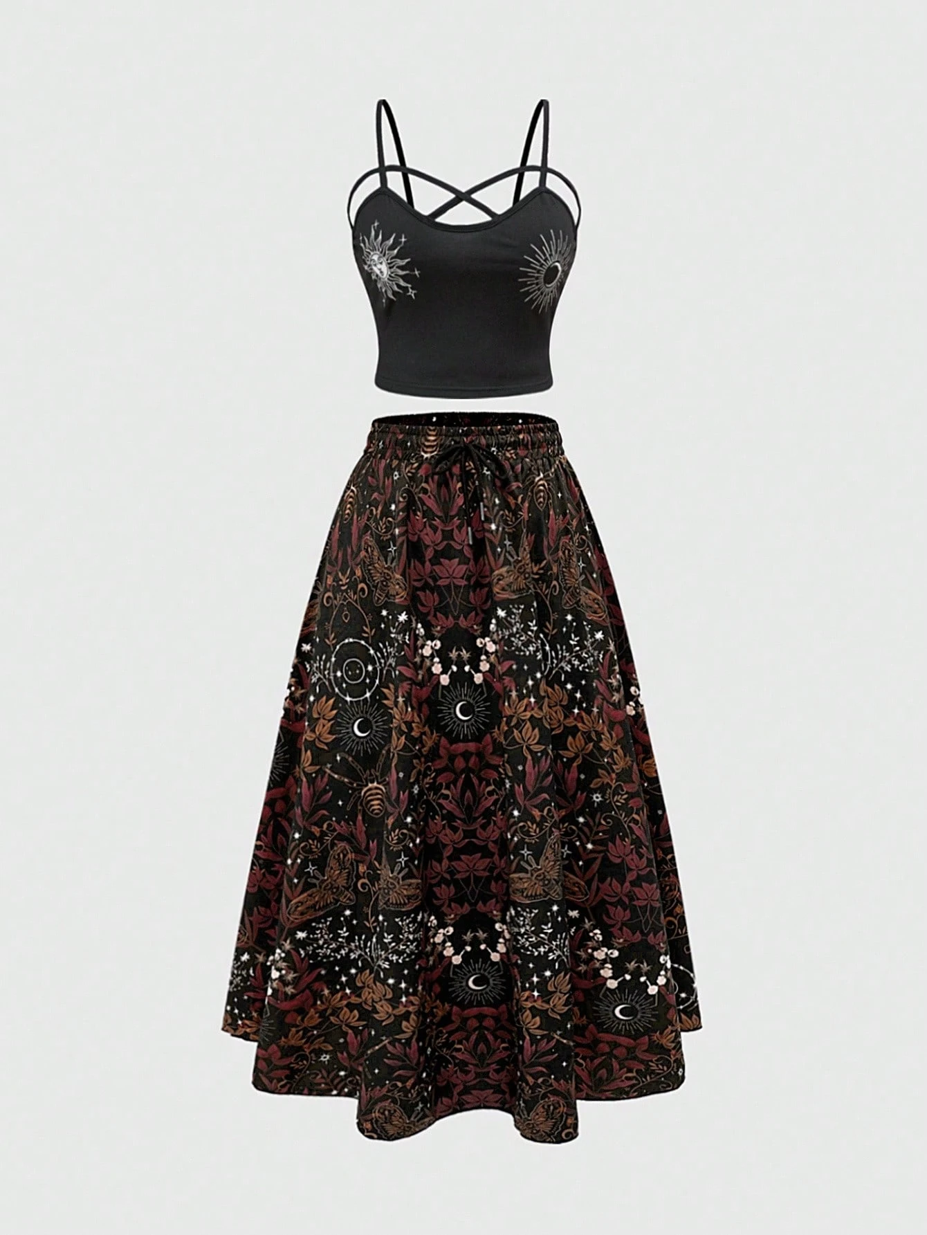 2 Stücke/Set Damen Große Größen Urlaubs Gothic Blume Muster Trägerhemd und Midi Rock mit Gummibund