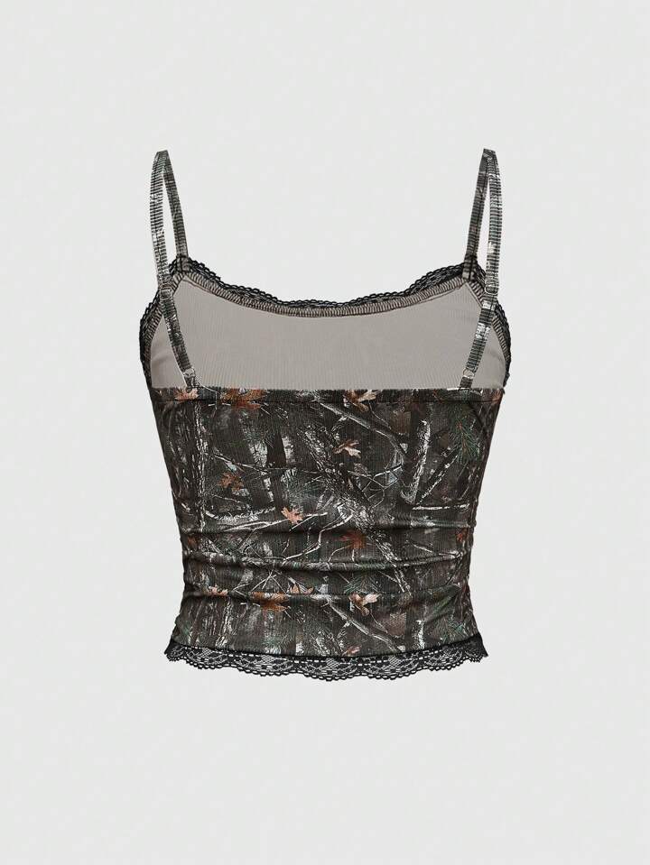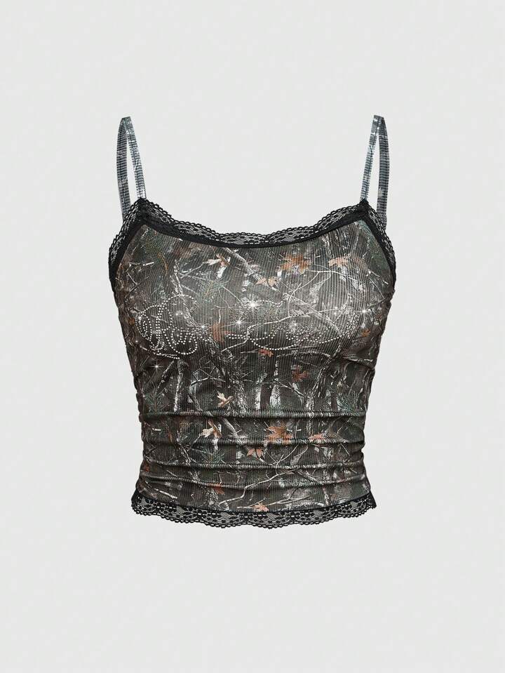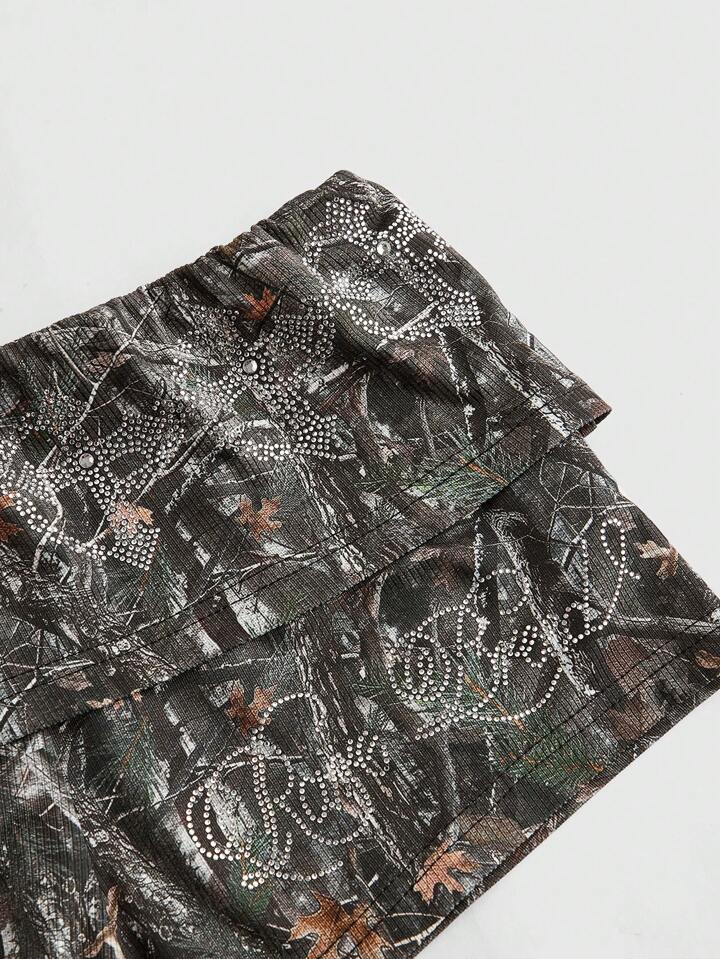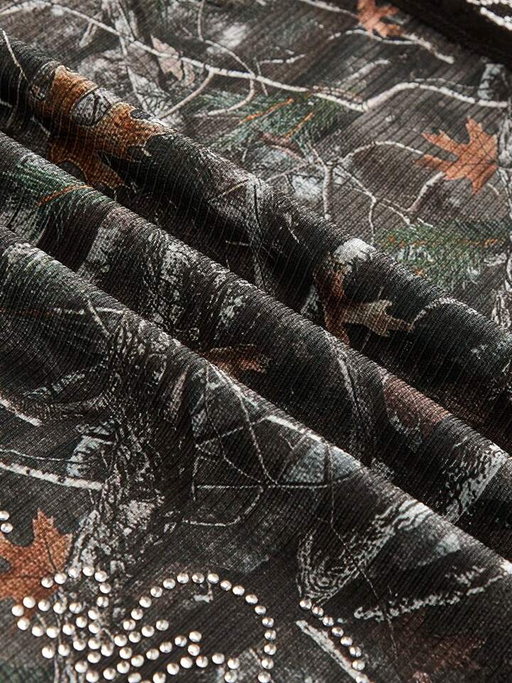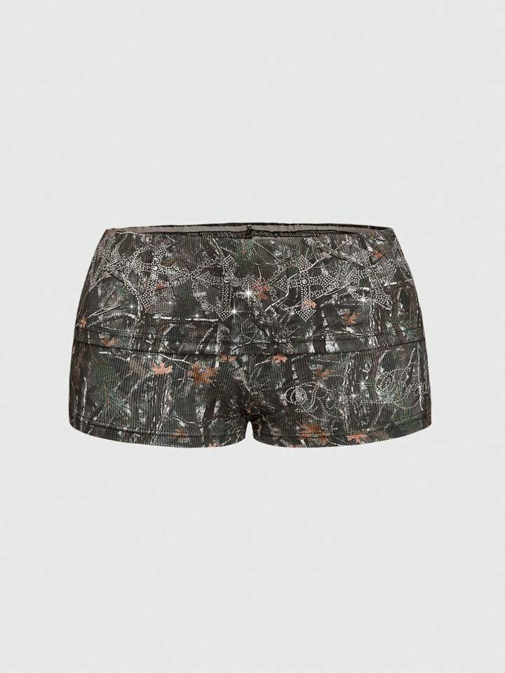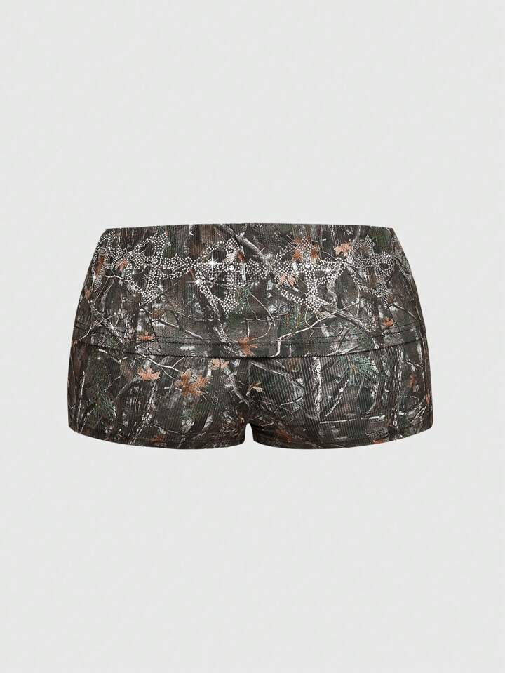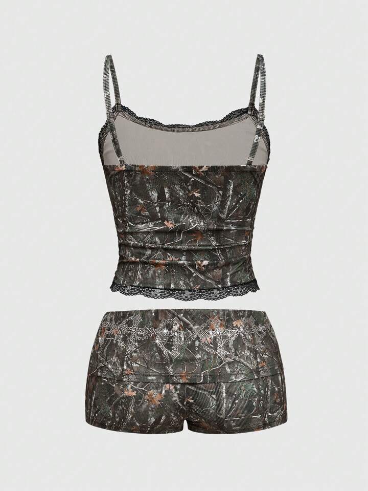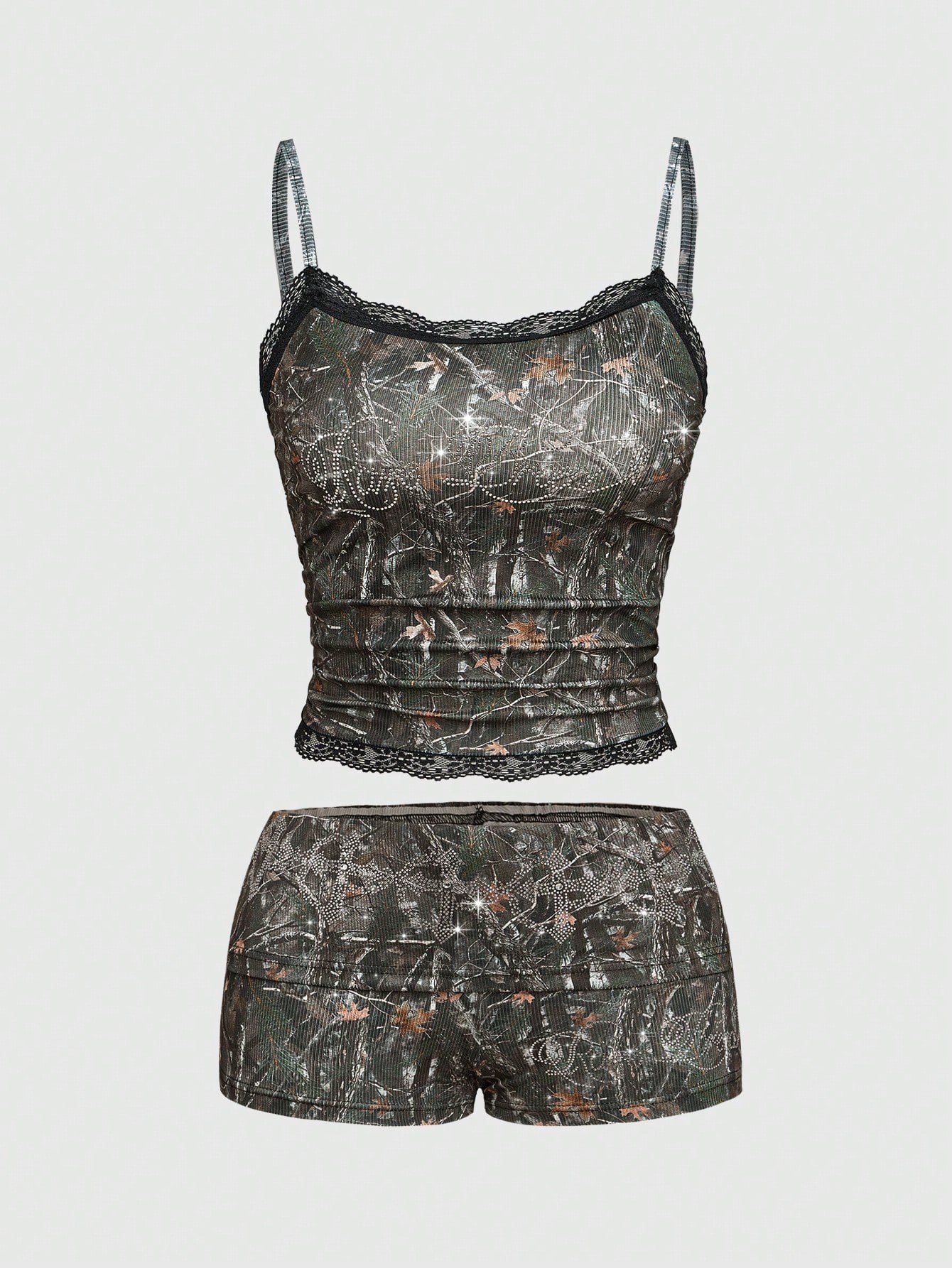 2 Stücke Set für Damen, Avantgarde-Y2K-Streetstyle, Samt, Camouflage-Print, Strass-verziertes Camisole und Shorts mit niedriger Taille