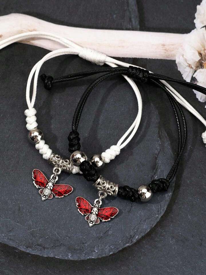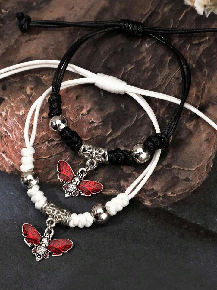 2-teiliges Armband-set Mit Kleinem Motte- Und Totenkopf-anhänger Im Vintage-gothic-stil