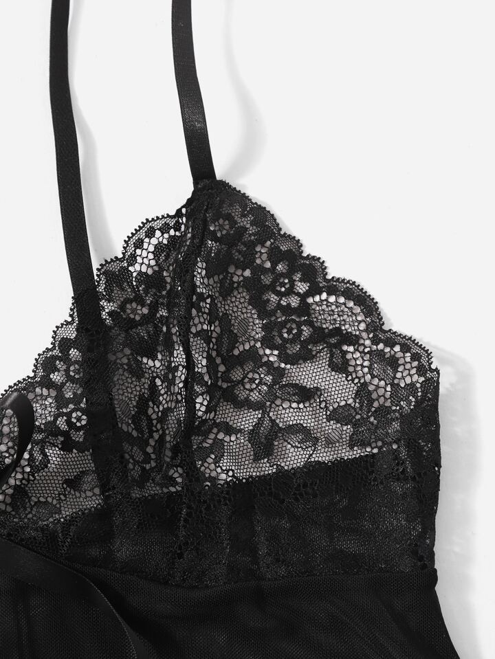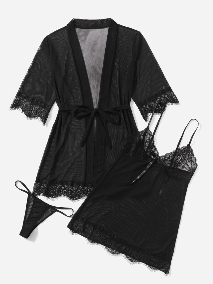 3-teiliges Dessous-Set bestehend aus Slip mit Kontrastspitze und Netzstoff, String-Slip und gürtelversehenem Morgenmantel