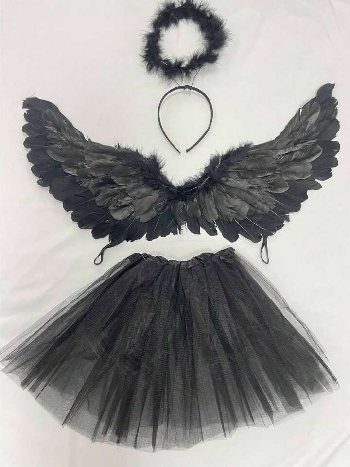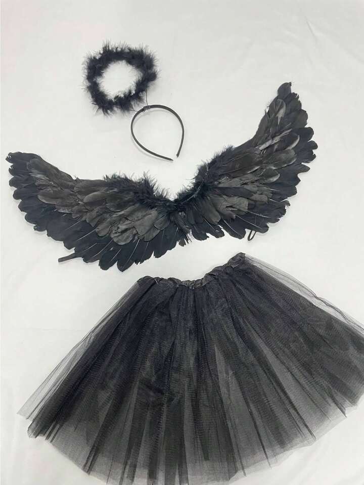 3 Stück/Set Engelskostüm und Teufelskostüm mit Federflügeln für kleine Mädchen, für Make-up, Tanzparty, inkl. Flügel, Tüllrock und Haarband, Halloween