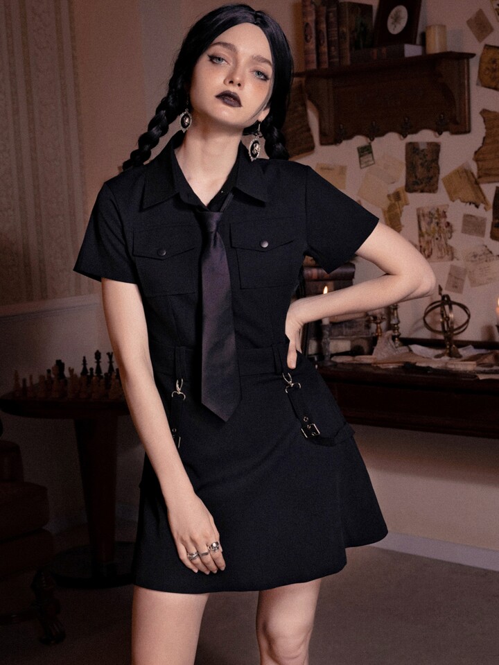 Dark Academia Kleid mit Pattentasche, Kontrast Gurt
