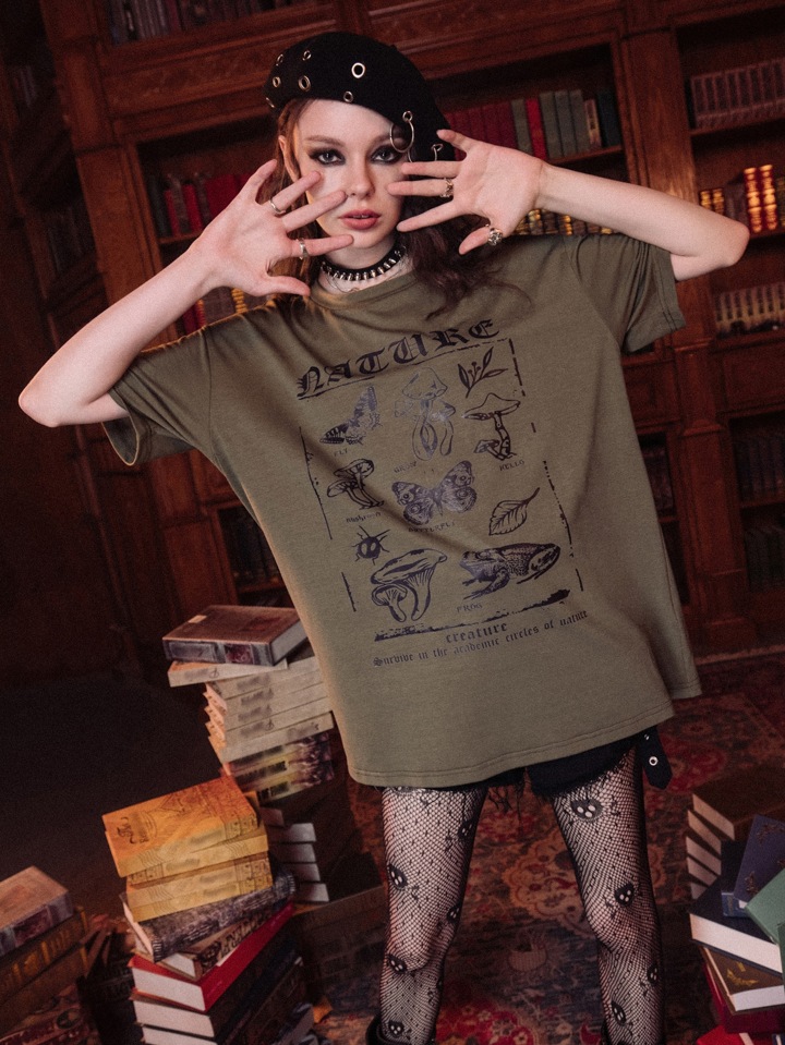 Dark Academia Übergroßes T-Shirt mit Buchstabe Schmetterling & Pilz Grafik