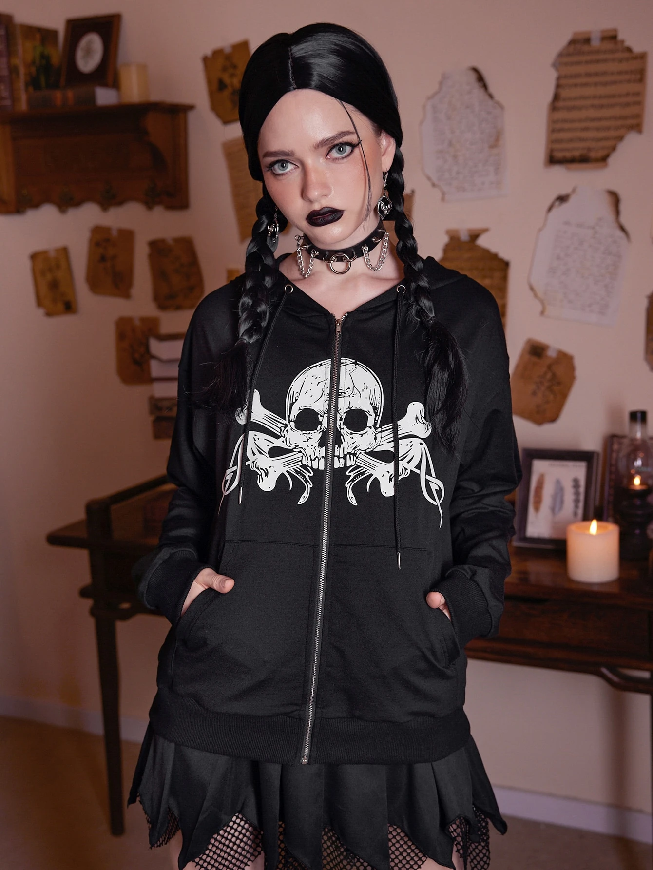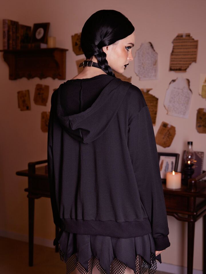Academia Hoodie mit Schädel Grafik, Reißverschluss, Tasche, Tunnelzug