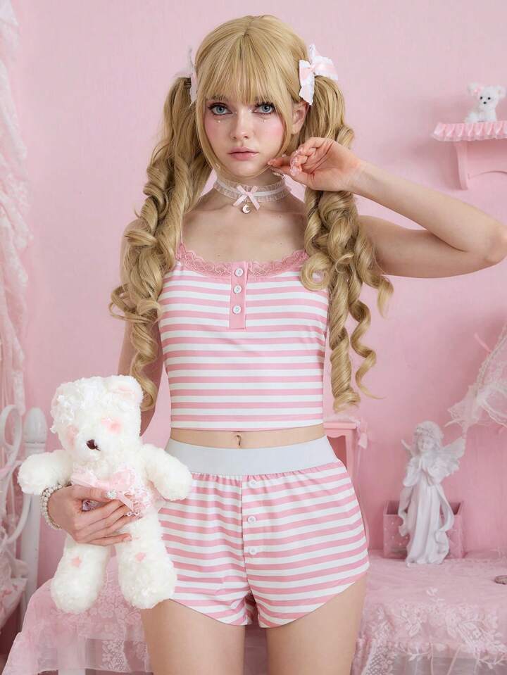 Academia Damen Sommer Lässig Campus gestreifter Knopf Pyjama Set