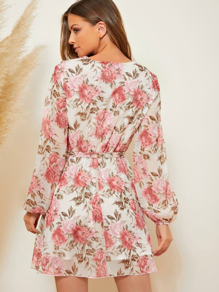 Chiffon Kleid mit Blumen Muster, Laternenärmeln und Gürtel