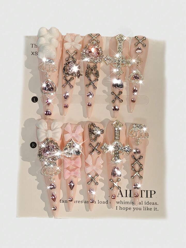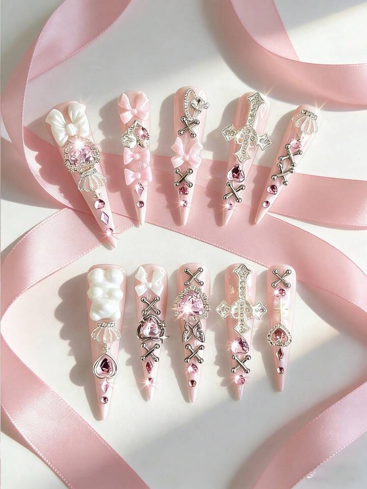 Anime 10 Stück süße Schleifen-Musik-Noten-Stern-Elemente hochwertige handgefertigte Kunstnägel + 3 Stück doppelseitiger Kleber, Y2K französischer Stil Strass-Kette Polka-Punkt abnehmbare Nail-Art-Aufkleber, geeignet für Feiertage, Partys, Tanzen und den täglichen Gebrauch